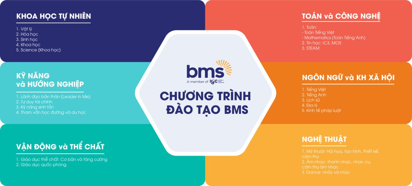 Chương trình giáo dục của BMS.được thiết kế khoa học, hài hòa kết hợp Chương trình Giáo dục 2018 của Bộ Giáo dục và Đào tạo (MOET) với các nội dung giảng dạy tăng cường, nâng cao và bổ trợ, trongg nhiều lĩnh vực như Toán, Tiếng Việt, Tiếng Anh, Thể chất, và STEAM.