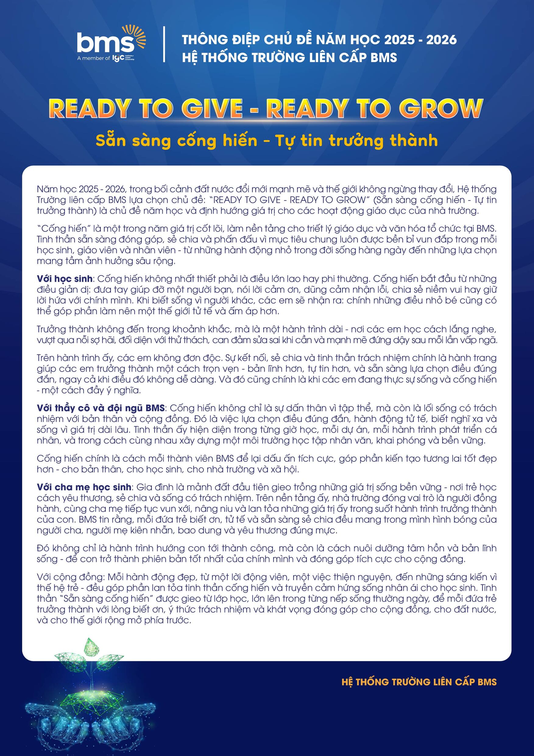 Thông điệp năm học 2025 - 2026 Hệ thống Trường liên cấp BMS: “READY TO GIVE – READY TO GROW” (Sẵn sàng cống hiến – Tự tin trưởng thành)