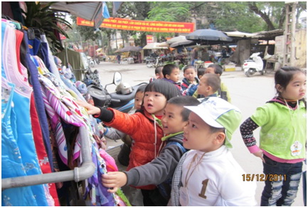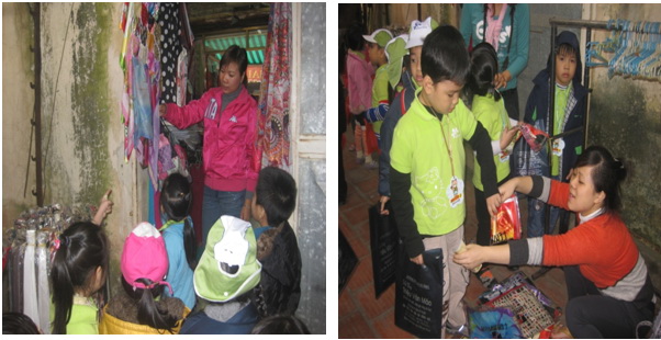 dệt, các bạn nhỏ còn thích thú hơn khi được tham quan các gian hàng bán sản phẩm lụa Vạn Phúc và được trổ tài mua sắm. Các bạn đều tỏ ra khá giỏi trong giao tiếp với người bán hàng, tự tin trao đổi với người bán hàng về nhu cầu của mình, sở thích của mình… và còn sành mua bán nũa. Các bạn lựa chọn cho mình những món quà thật đẹp, có thẩm mỹ để dành tặng người thân của mình (Có bạn mua tặng mẹ,có bạn mua tặng bà, tặng chị…)