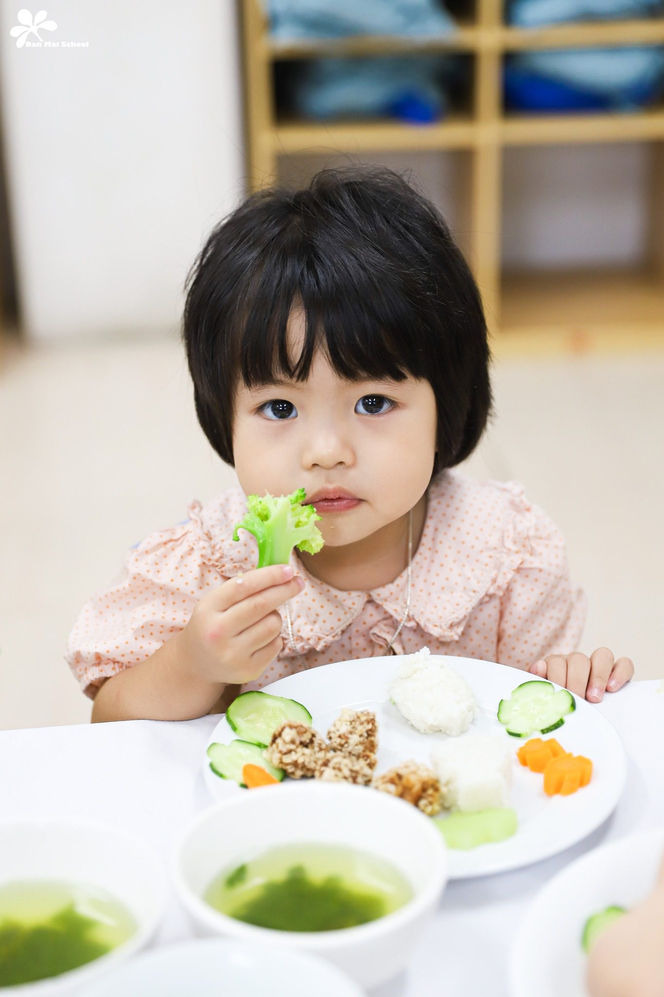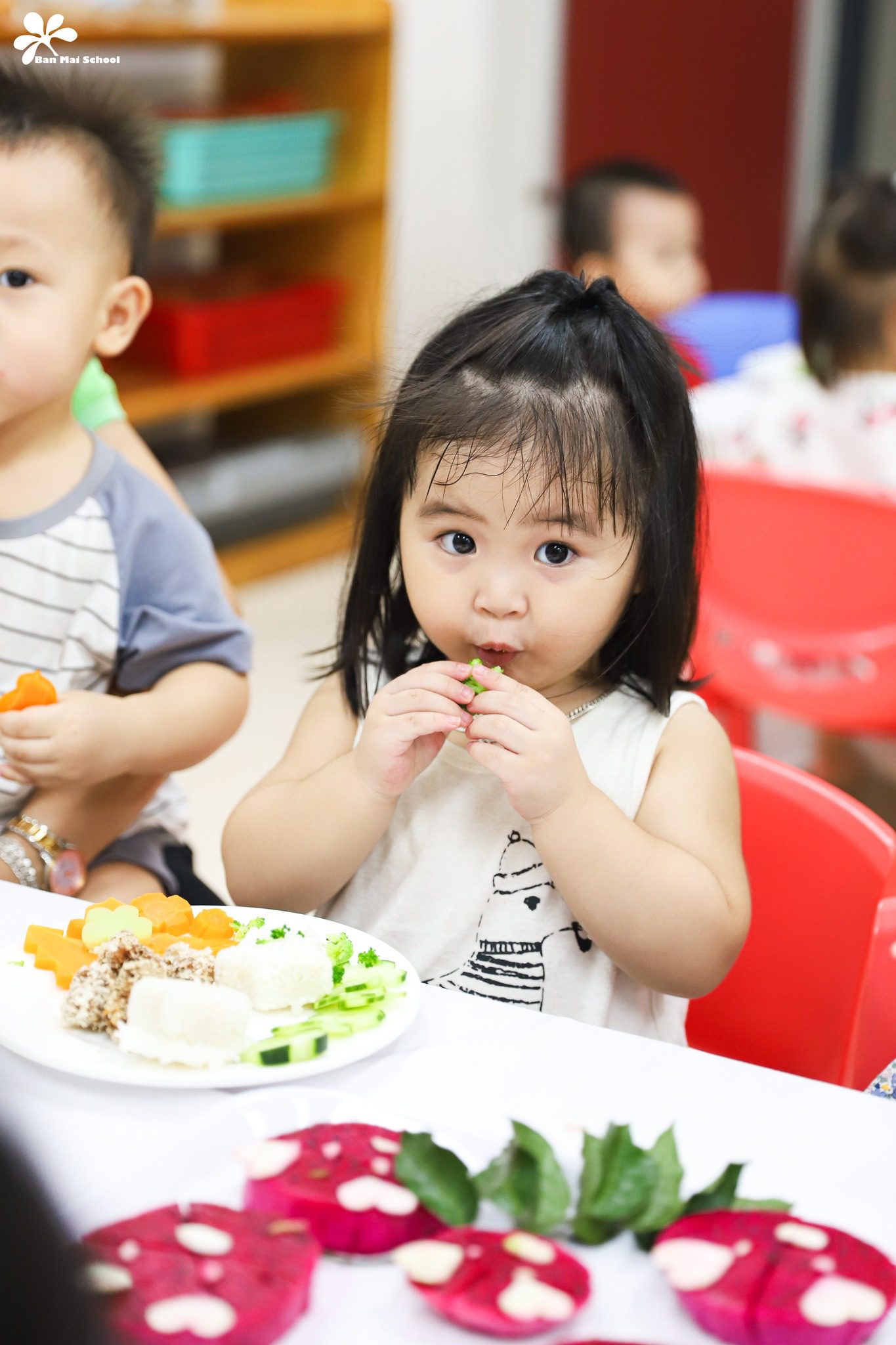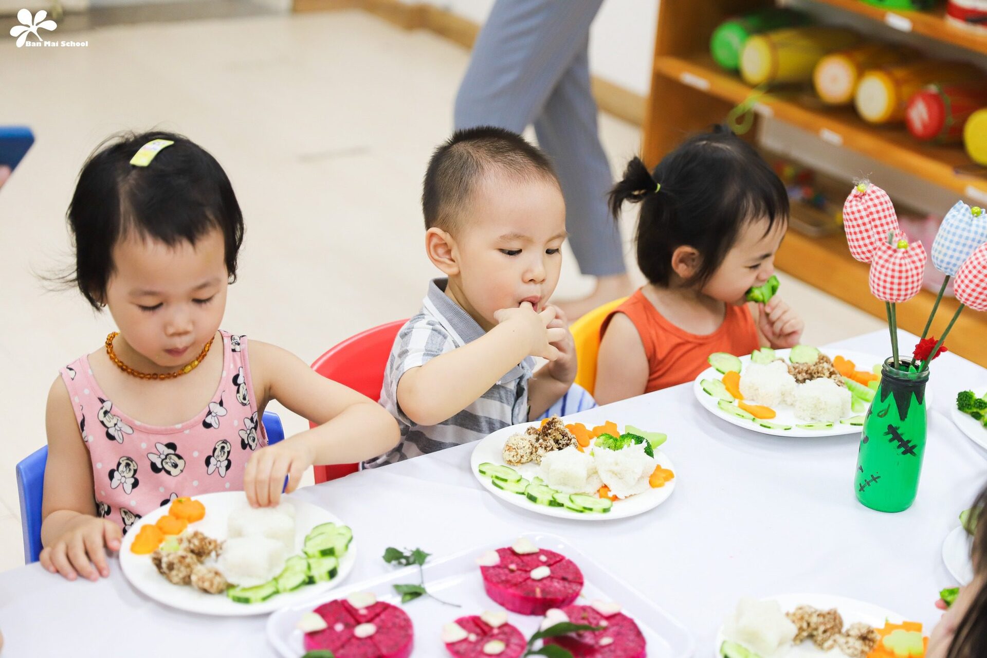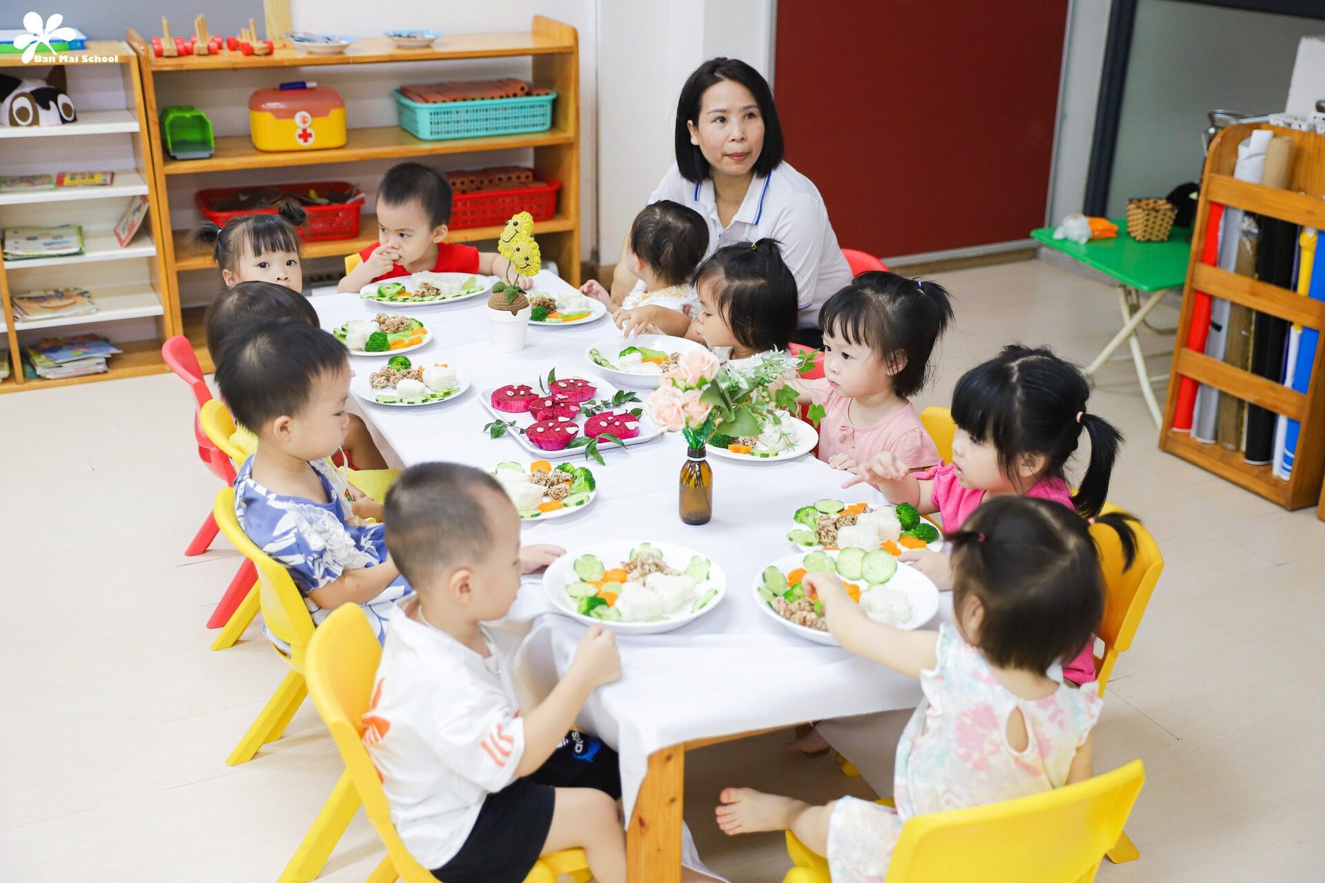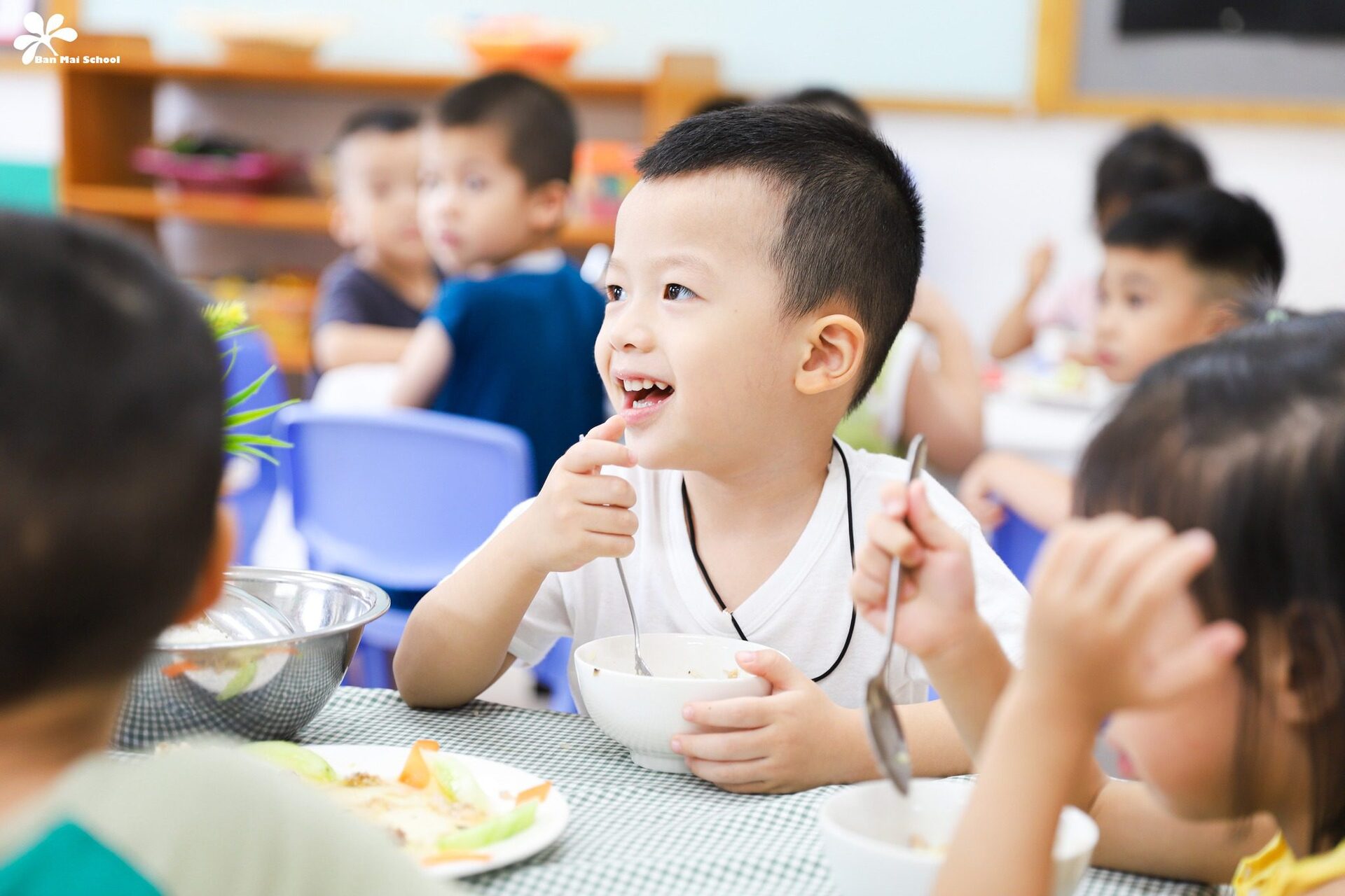 Bên cạnh chế độ dinh dưỡng được xây dựng chuyên biệt cho trẻ ở từng lứa tuổi, những giờ ăn hạnh phúc tại Ban Mai cũng là dịp để BMSers hình thành thói quen và kỹ năng tự phục vụ.