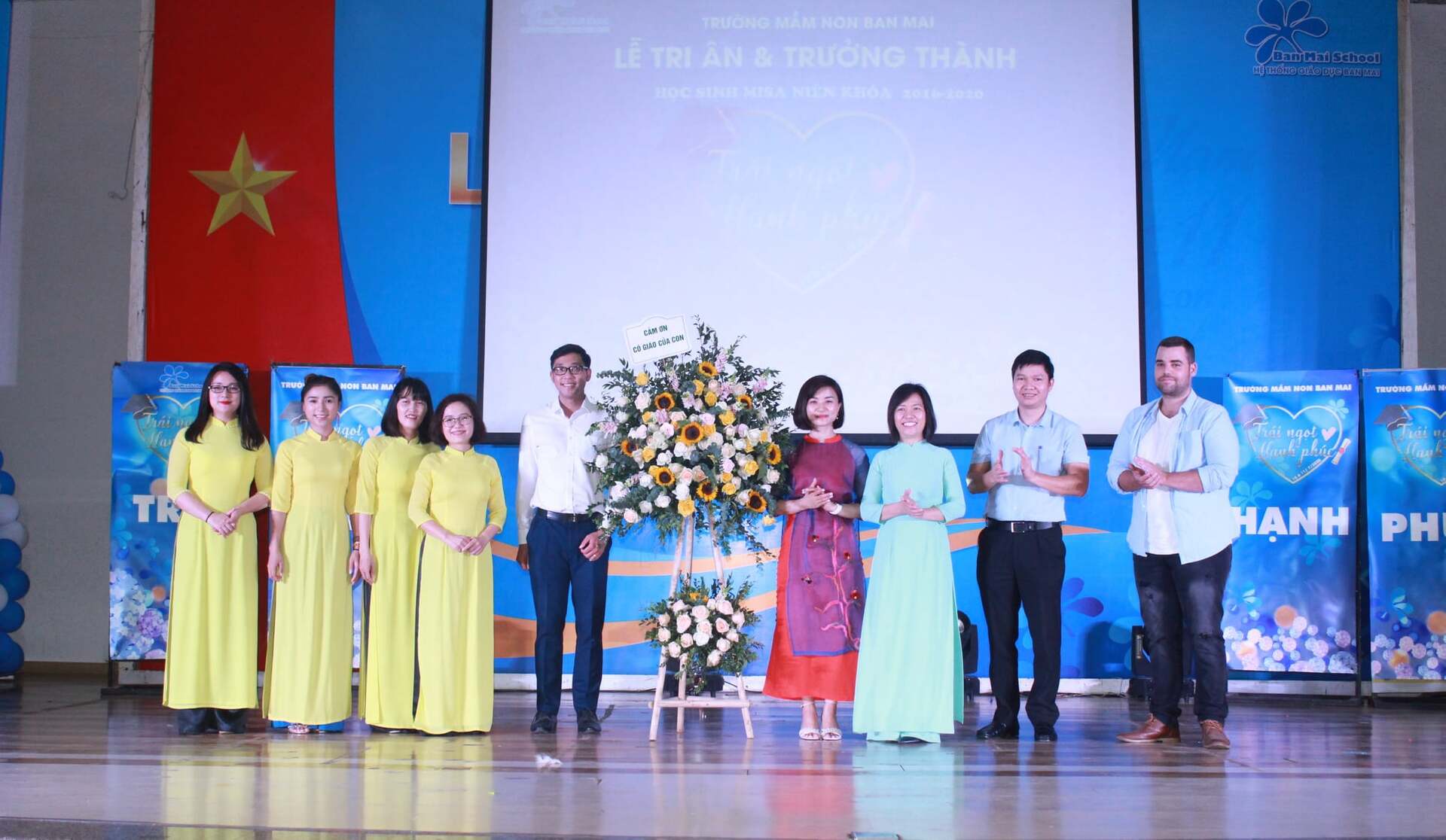 Đại diện Ban phụ huynh gửi lẵng hoa tươi thắm đến Ban giám hiệu nhà trường thay cho lời cảm ơn các cô đã chăm sóc và dạy dỗ các con trong thời gian qua.