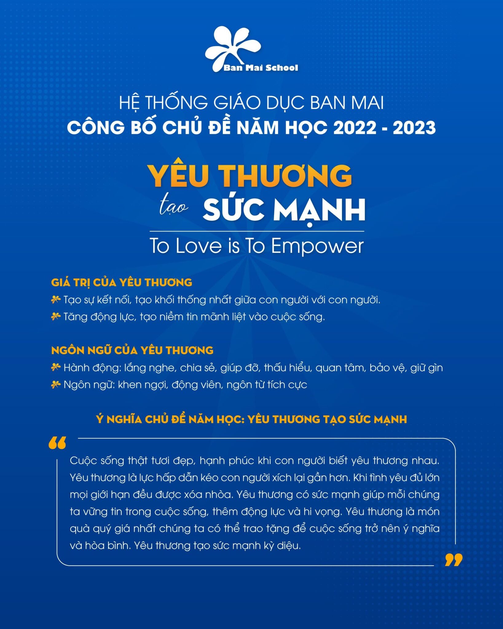 “Yêu thương tạo sức mạnh” (To Love is To Empower) là chủ đề năm học mới 2022- 2023 của Hệ thống Giáo dục Ban Mai.