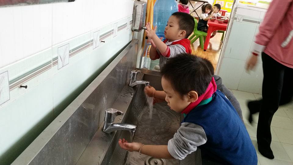 Các con lớp Donald biết xếp hàng lần lượt đi rửa tay