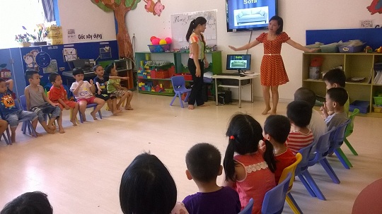 Chỉ sau ba buổi học được Ms Trang và Ms Mỹ hướng dẫn thông qua những hình ảnh sinh động, những trò chơi tương tác như Matching game, Jumping game và trò chơi được thiết kế trên Powerpoint như Word game, các bé đã có thể kể tên những vật dụng trong nhà mà bé đã được học và còn có thể kể chính xác được vật dụng đó nằm trong phòng nào trong ngôi nhà của bé nữa đó. Nhiều bé còn giơ tay thật cao xung phong lên bảng để xếp các vật dụng đó vào các phòng giống như trong nhà của bé để nhận được thật nhiều stickers thật đẹp để về khoe với ba mẹ.