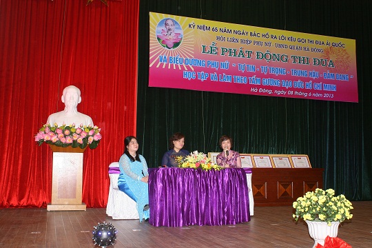 Phát biểu tại buổi lễ, đồng chí Nguyễn Thị Hảo – Chủ tịch Hội LHPN Q. Hà Đông đã ôn lại truyền thống của phụ nữ Việt Nam anh hùng, bất khuất, trung hậu, đảm đang trong các thời kỳ của đất nước. Đặc biệt truyền thống ấy càng được phát huy trong thời kỳ công nghiệp hóa, hiện đại hóa và hội nhập quốc tế bằng những phong trào thi đua cụ thể, thiết thực như: “Giỏi việc nước, đảm việc nhà”, “Lao động giỏi”, “Phụ nữ tích cực học tập, lao động sáng tạo, xây dựng gia đình hạnh phúc”……
