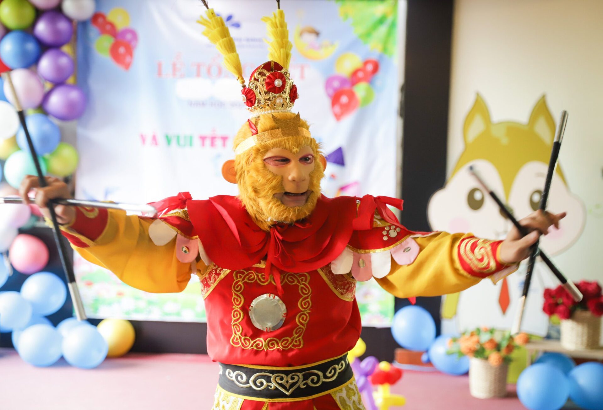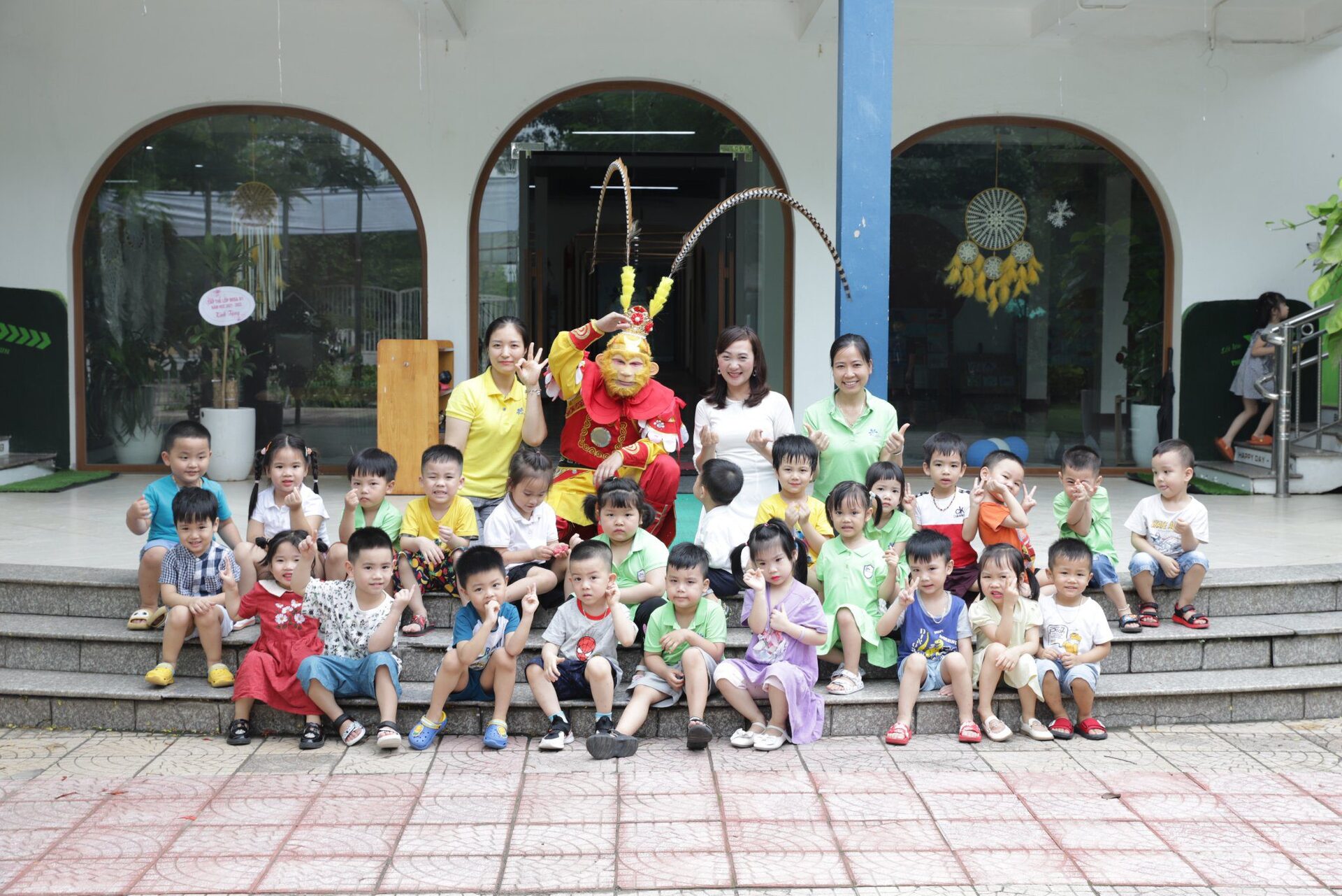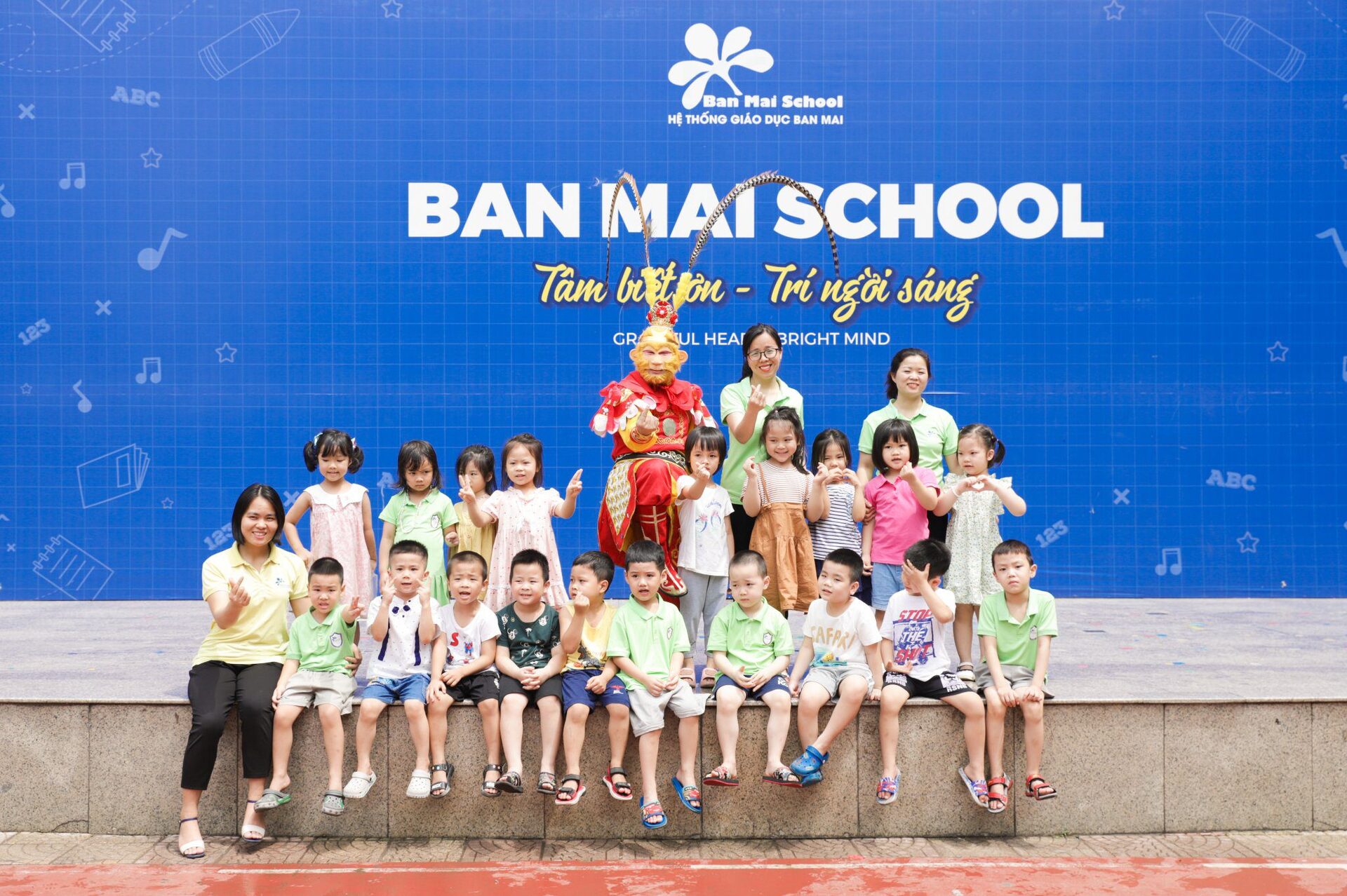 Ở khúc cao trào của chương trình, các con đã có dịp “mắt chữ O, miệng chữ A” trước sự xuất hiện của các Anh Hề, Tôn Ngộ Không và đặc biệt là Chú Khỉ vô cùng đáng yêu, ngộ nghĩnh. Các con không quên níu chân Tề Thiên Đại Thánh để lưu giữ những bức ảnh cùng tập thể lớp mình, những người bạn sẽ cùng các con bước tiếp trên hành trình nuôi dưỡng những em bé hạnh phúc tại Ban Mai.
