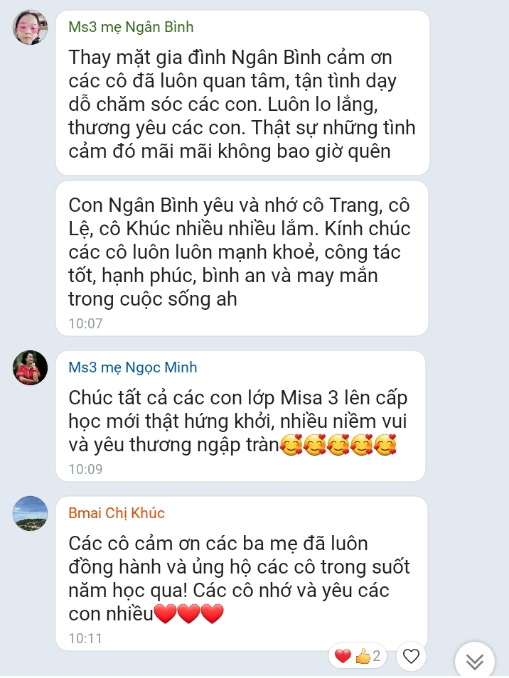 Để có được những trái ngọt hạnh phúc ngày hôm nay là công sức rất lớn của cả các cha mẹ và các thầy cô. Ban Mai lưu giữ lại đây những lời chia sẻ tình cảm chân thành của các quý phụ huynh. Đó cũng là động lực để Ban Mai luôn vững bước trên sự nghiệp “gieo những hạt giống tương lai” của mình. Chúc quý phụ huynh và gia đình luôn bình an, mạnh khỏe, hạnh phúc và luôn nhớ về Ban Mai – ngôi trường tuổi thơ của các BMSers.