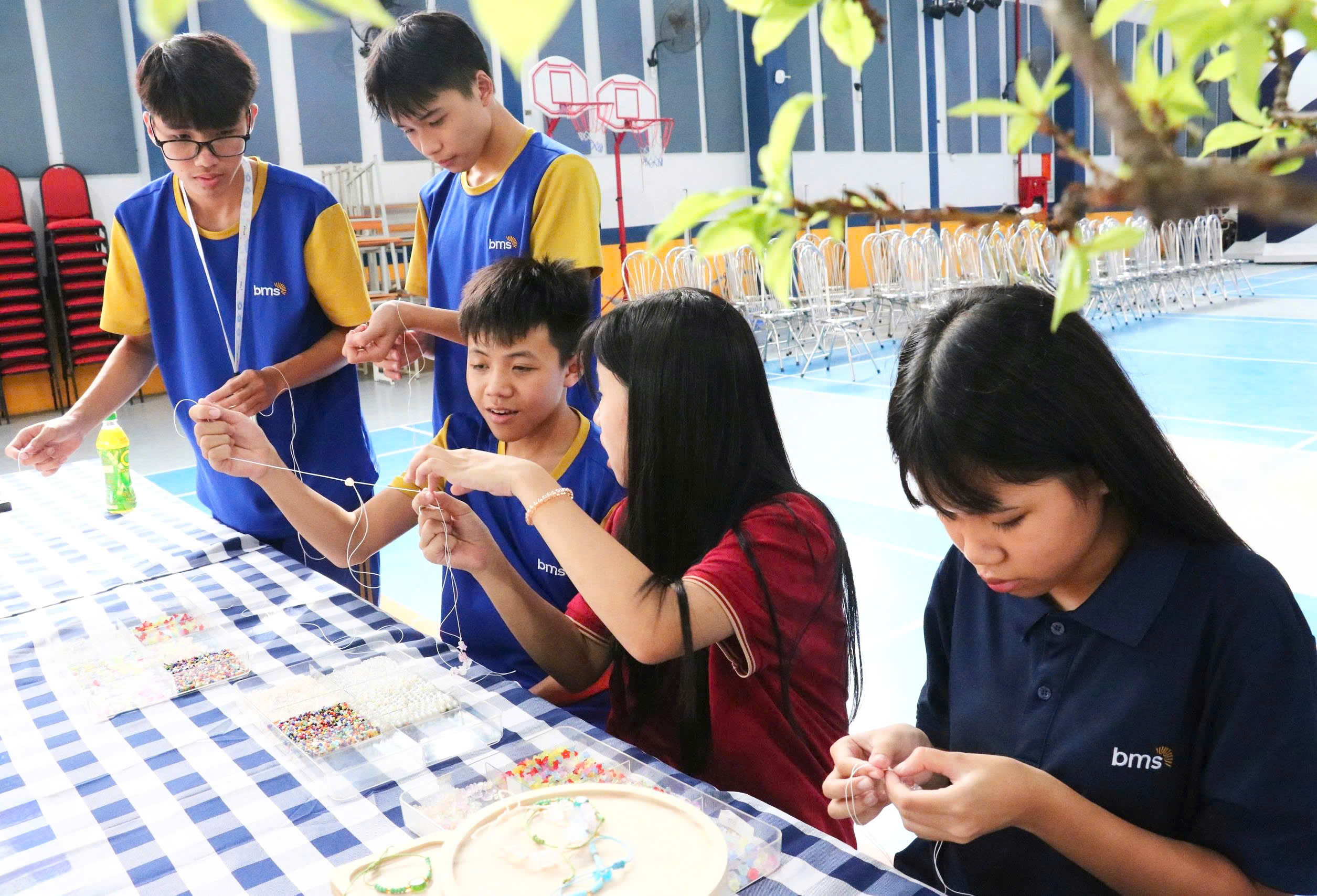 Song song với cuộc thi hùng biện, workshop “Vòng tay yêu thương” diễn ra trong bầu không khí ấm áp và rộn ràng. Dưới bàn tay khéo léo của mình, các bạn học sinh đã tỉ mỉ xỏ từng hạt cườm, kết nên những chiếc vòng nhỏ xinh để gửi tặng đến những người phụ nữ thân yêu: mẹ, cô giáo, chị gái hay bạn bè…