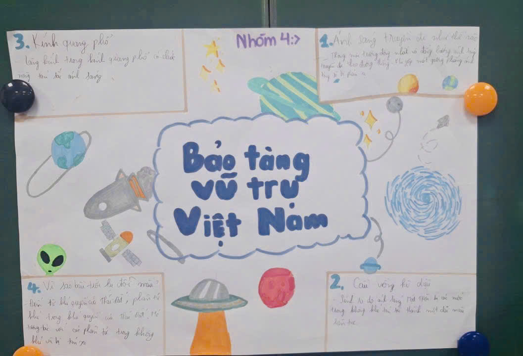 Nhiều nhóm đã vẽ ra các mô hình mô phỏng vũ trụ, tái hiện quỹ đạo các hành tinh, chuyển động của Trái Đất hay hoạt động của vệ tinh nhân tạo đầy sắc mắc. Những sản phẩm ấy là kết quả của quá trình học tập chủ động, gắn kết giữa quan sát – tư duy – thực hành, giúp học sinh củng cố kiến thức một cách sâu sắc và bền vững.