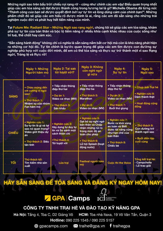 Tại Trại hè Future Me: Radiant Stars – Ngôi sao Rạng Ngời, trại sinh có thể khám phá sự tự tin của chính mình bằng cách bộc lộ Sức mạnh Nội tại trong nhiều khía cạnh khác nhau của cuộc sống cá nhân, dù là trí tuệ, thể chất hay cảm xúc, đồng thời học hỏi và thực hành 7 nền tảng của một thiếu niên tự tin: