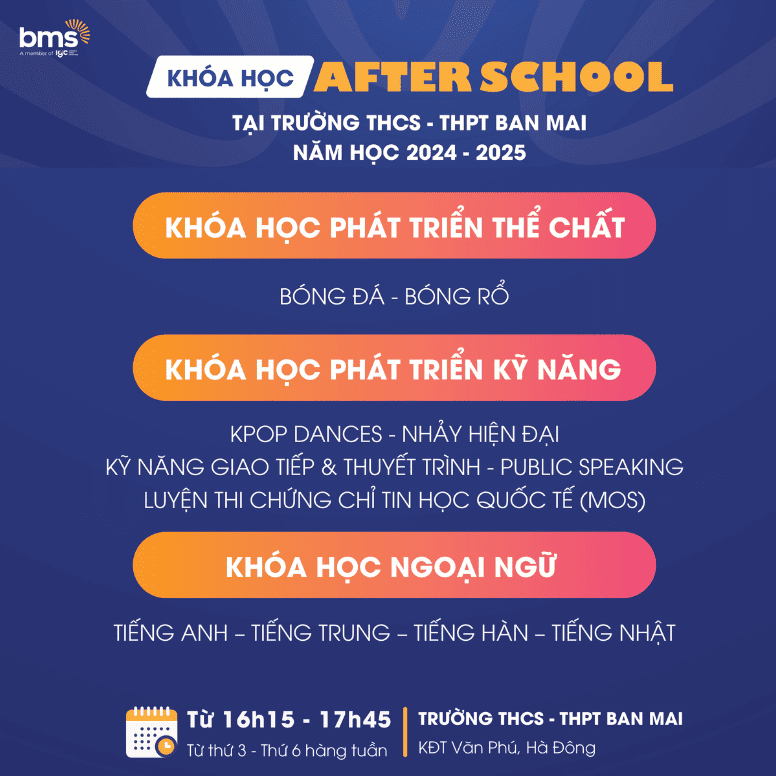 BMsers đã sẵn sàng chinh phục năm học mới với các khóa học After school cực chất? Khám Phá Đam Mê: Từ thể thao đến nghệ thuật, tìm kiếm và theo đuổi niềm yêu thích của bạn. Kết Nối Bạn Mới: Giao lưu, làm quen và học hỏi cùng những người bạn mới. Rèn Luyện Kỹ Năng: Phát triển kỹ năng giao tiếp, thuyết trình và nhiều kỹ năng quan trọng khác. Chuẩn Bị Tương Lai: Đạt chứng chỉ quốc tế và chuẩn bị cho các kỳ thi IELTS. Khám Phá Tiềm Năng: Tham gia các sân chơi học thuật và thể thao, thể hiện bản thân và tự tin bứt phá.