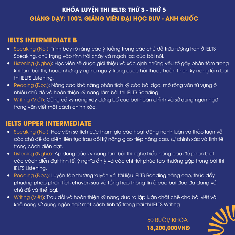 IELTS INTERMEDIATE A (4.5 - 5.0) & B (5.0 - 5.5): Củng cố và phát triển kỹ năng Anh ngữ.