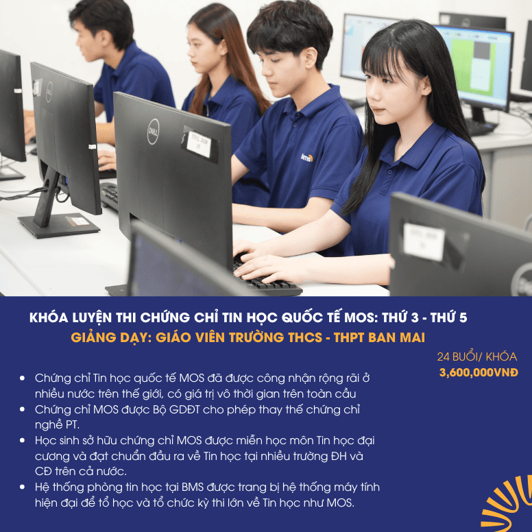 •Luyện thi chứng chỉ Tin học Quốc tế (MOS); Chứng chỉ MOS - Microsoft Office Specialist là một chứng nhận quốc tế, được công nhận trên toàn thế giới, chứng minh người học có khả năng sử dụng công nghệ thông tin một cách chuyên nghiệp.