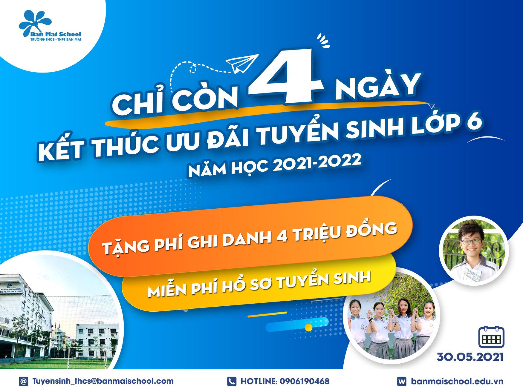 CHỈ CÒN 04 NGÀY KẾT THÚC CHƯƠNG TRÌNH ƯU ĐÃI TUYỂN SINH LỚP 6 NĂM HỌC 2021-2022