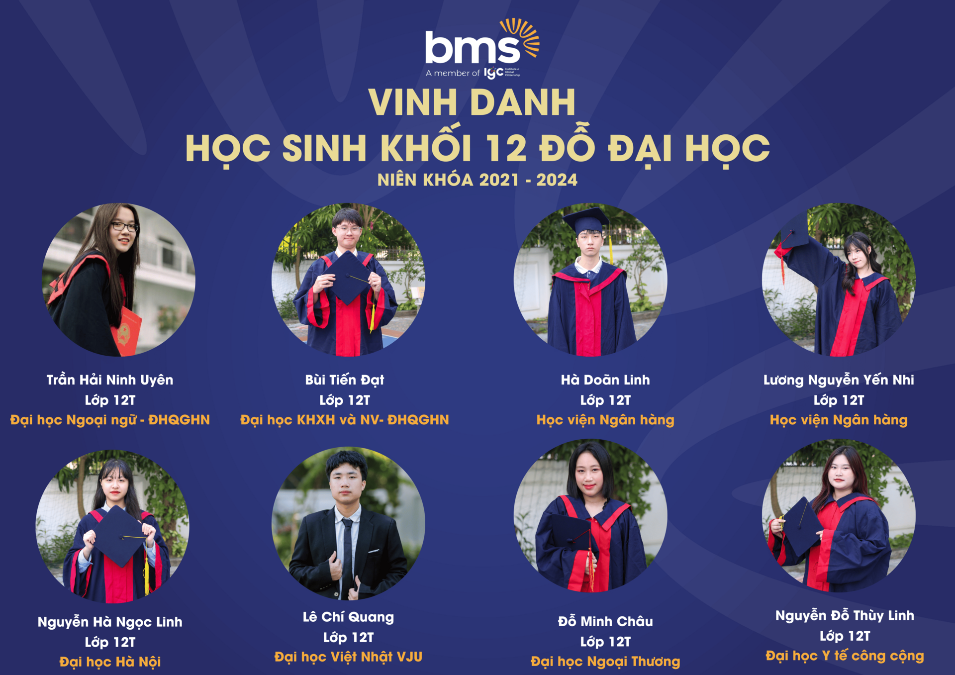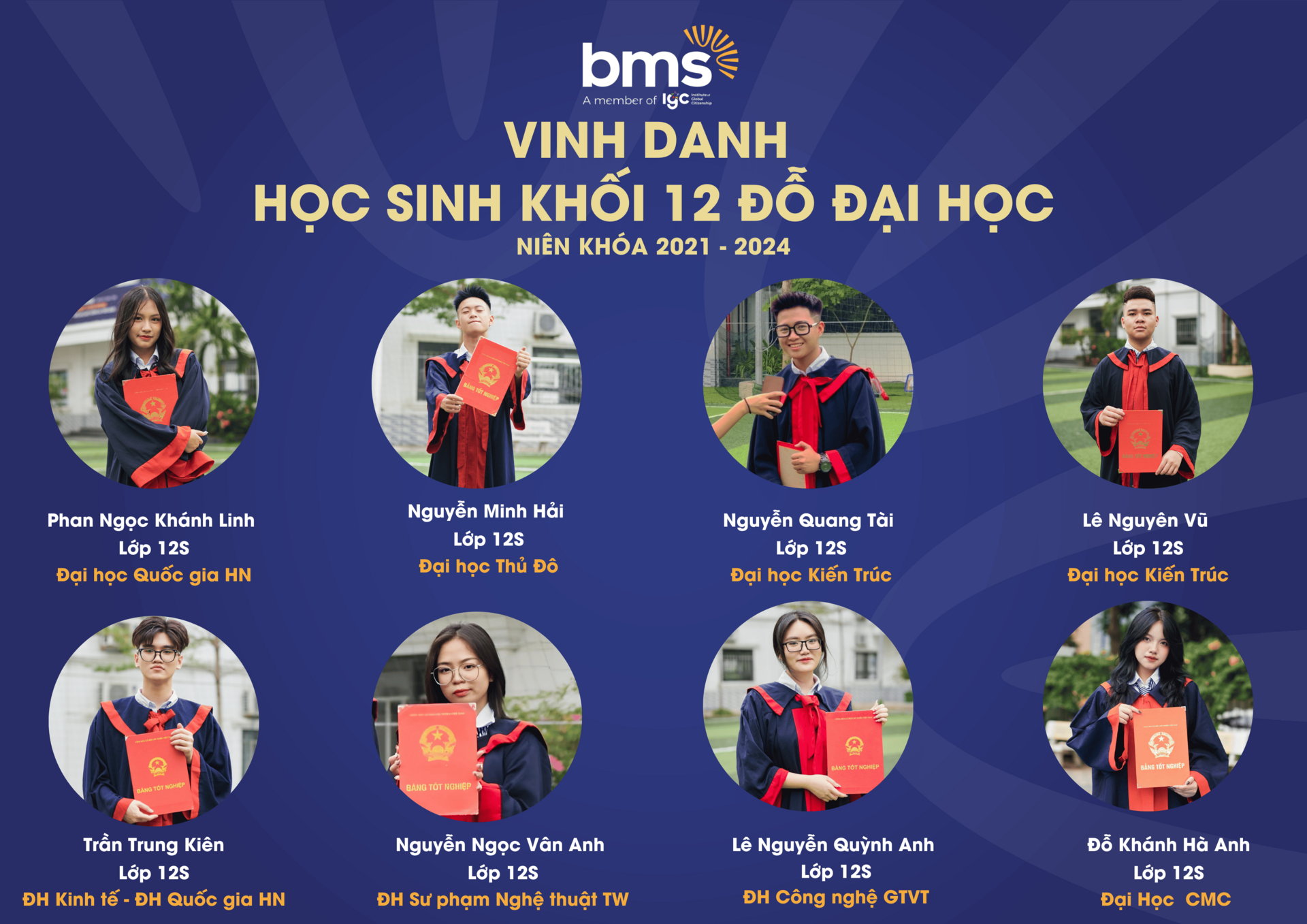 Thầy cô tự hào vinh danh thành tích xuất sắc của 100% học sinh Khối 12 (niên khóa 2021 – 2024) đã gặt hái những trái ngọt mang tên “Đỗ Đại học” trên hành trình giáo dục đầy khát vọng và kiên định của BMS.Với sự đồng hành tận tâm từ đội ngũ giáo viên, cùng phương pháp giảng dạy hiện đại, kết hợp giữa kiến thức và kỹ năng thực tiễn, BMS đã tạo nên một môi trường học tập - nơi mỗi học sinh được khơi dậy đam mê và định hướng tương lai. Thành tích 100% học sinh đỗ tốt nghiệp THPT và chinh phục bảng vàng Đại học là minh chứng cho chất lượng giáo dục vượt trội mà BMS mang đến cho mỗi thế hệ học sinh.