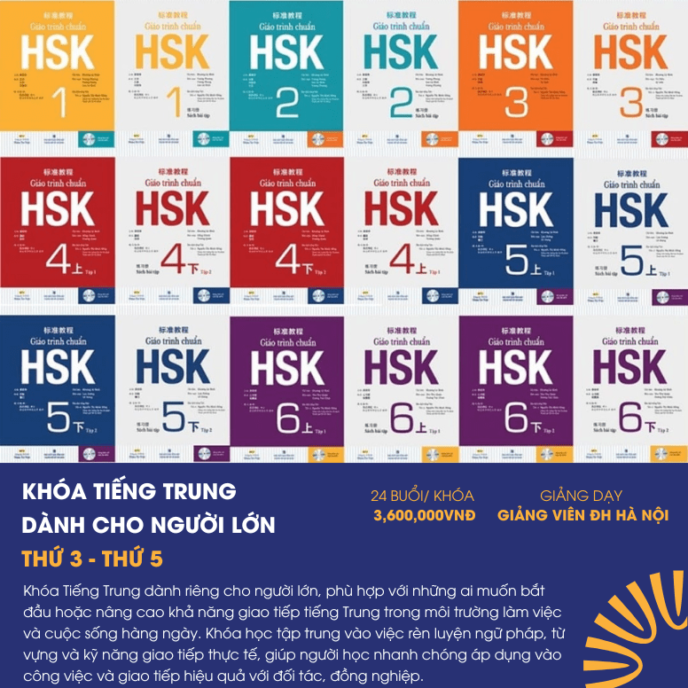 • Khóa Tiếng Trung cho người lớn: Khóa học tập trung vào việc rèn luyện ngữ pháp, từ vựng và kỹ năng giao tiếp thực tế, giúp học viên nhanh chóng áp dụng vào công việc và giao tiếp hiệu quả với đối tác, đồng nghiệp.