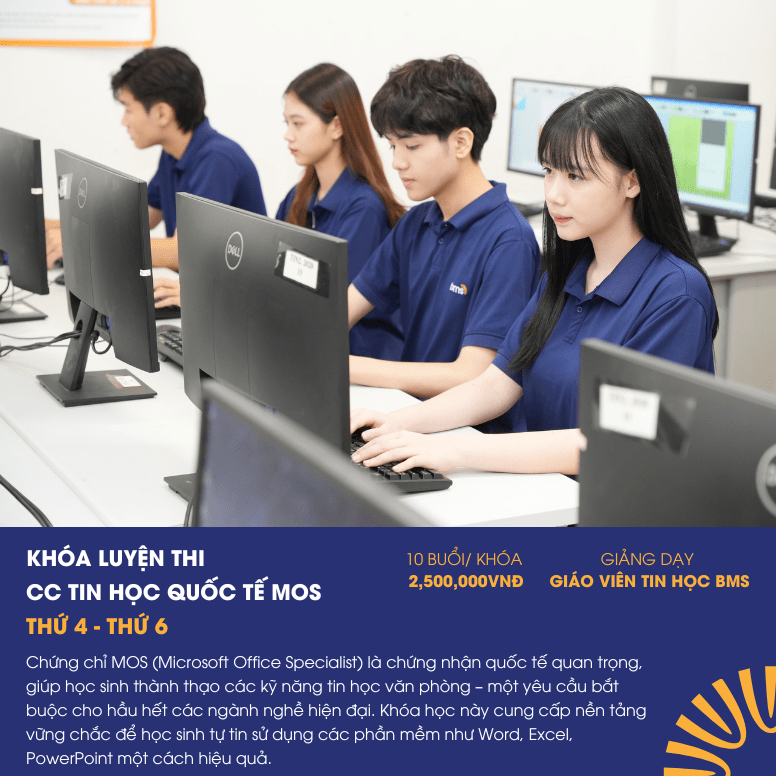 • Khóa Luyện thi chứng chỉ tin học quốc tế MOS: Luyện các kỹ năng tin học văn phòng chuẩn quốc tế, giúp học sinh tự tin sử dụng công nghệ trong học tập và công việc.