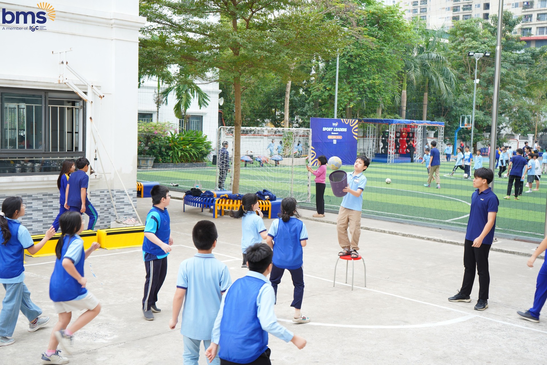 Và đặc biệt, ở BMS còn có những giờ thể thao cực kỳ vui nhộn. Các bạn được tham gia vào các trạm thể thao như: bóng đá, bóng rổ, bóng sọt, Be Warrior và võ thuật. Những hoạt động này giúp chúng ta giải trí, rèn luyện thể lực, phát triển kỹ năng vận động và làm việc nhóm. Bạn sẽ thoải mái tham gia các trận đấu, tranh tài với bạn bè và cùng nhau vui chơi!