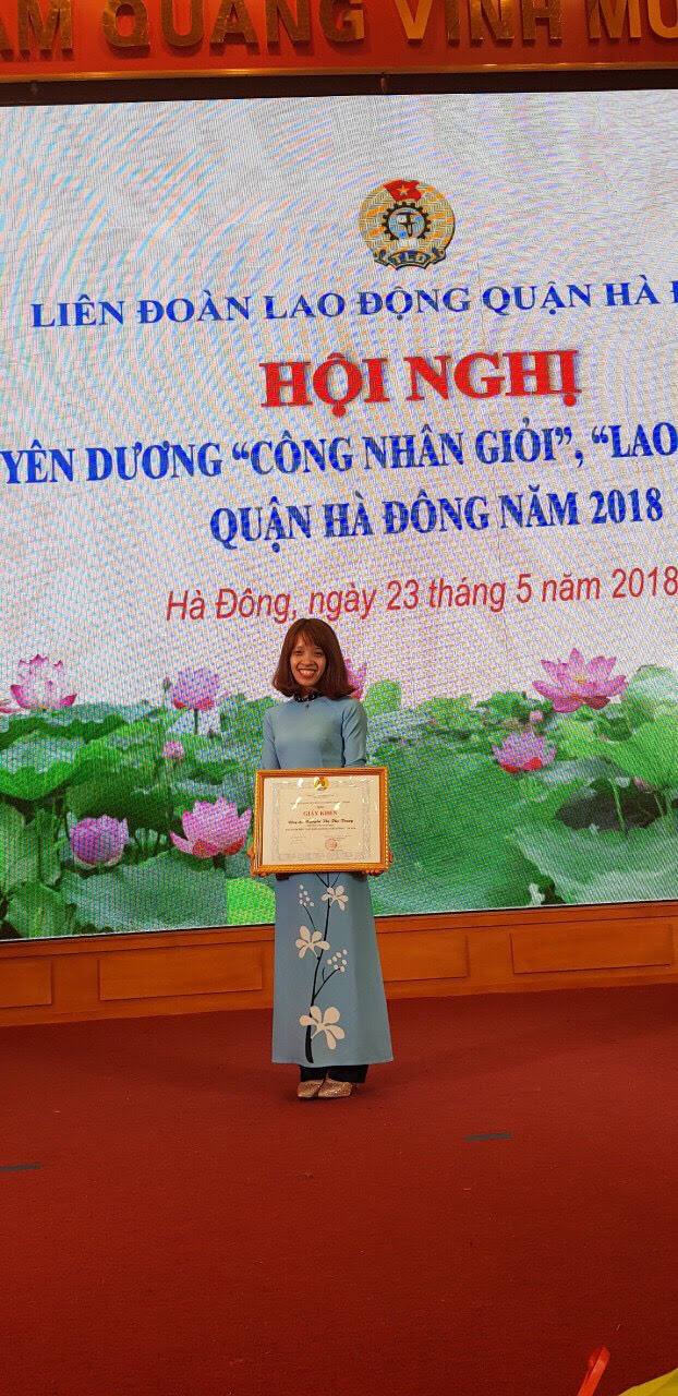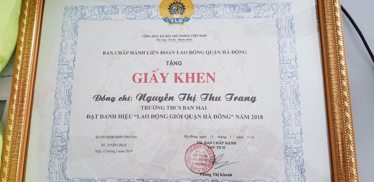 Cô Nguyễn Thị Thu Trang- Tổ trưởng Tổ Tự Nhiên và Năng khiếu trường THCS và THPT Ban Mai đã vinh dự được Ban Chấp Hành Liên Đoàn Lao Động Quận Hà Đông trao tặng danh hiệu: LAO ĐỘNG GIỎI QUẬN HÀ ĐÔNG NĂM 2018.