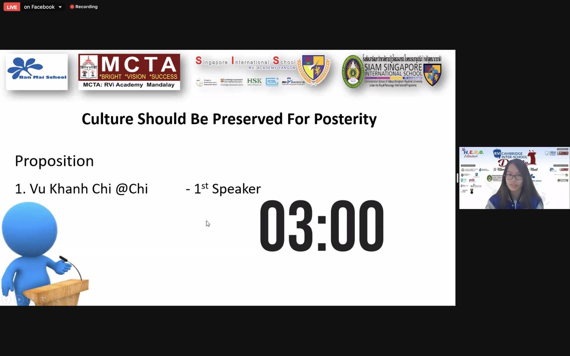 Đội thi “Upper Class” đến từ khối 10 Trường THPT Ban Mai đã dành chiến thắng trước các học sinh khối 10 đến từ trường Quốc tế Siam Singapore (SIS) để tiến vào vòng chung kết cuộc thi tranh biện tiếng Anh các trường Cambridge gặp đội Mandalay Chan Thar (MCTA).