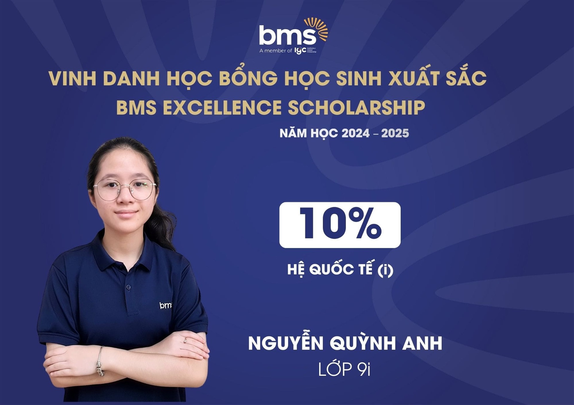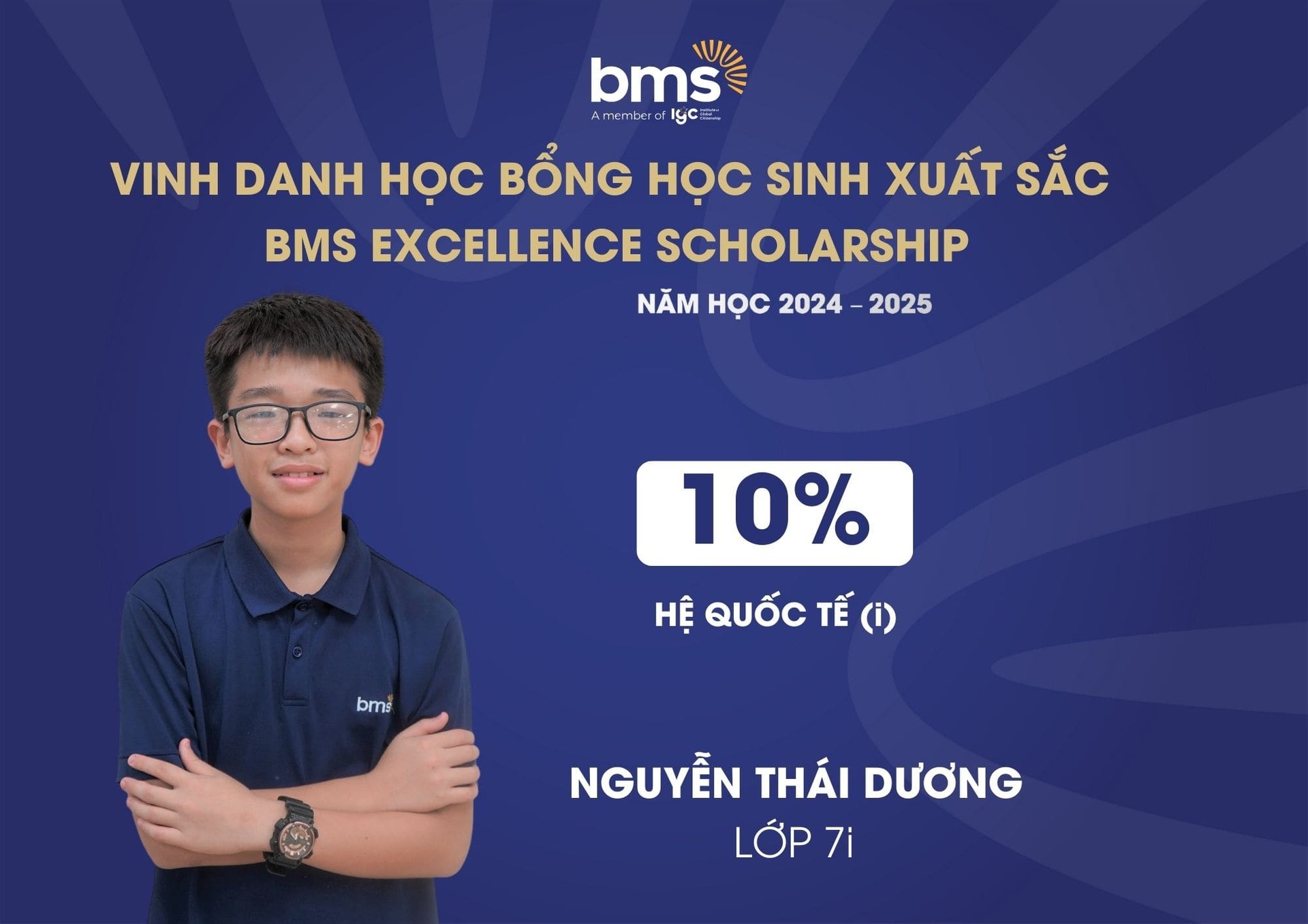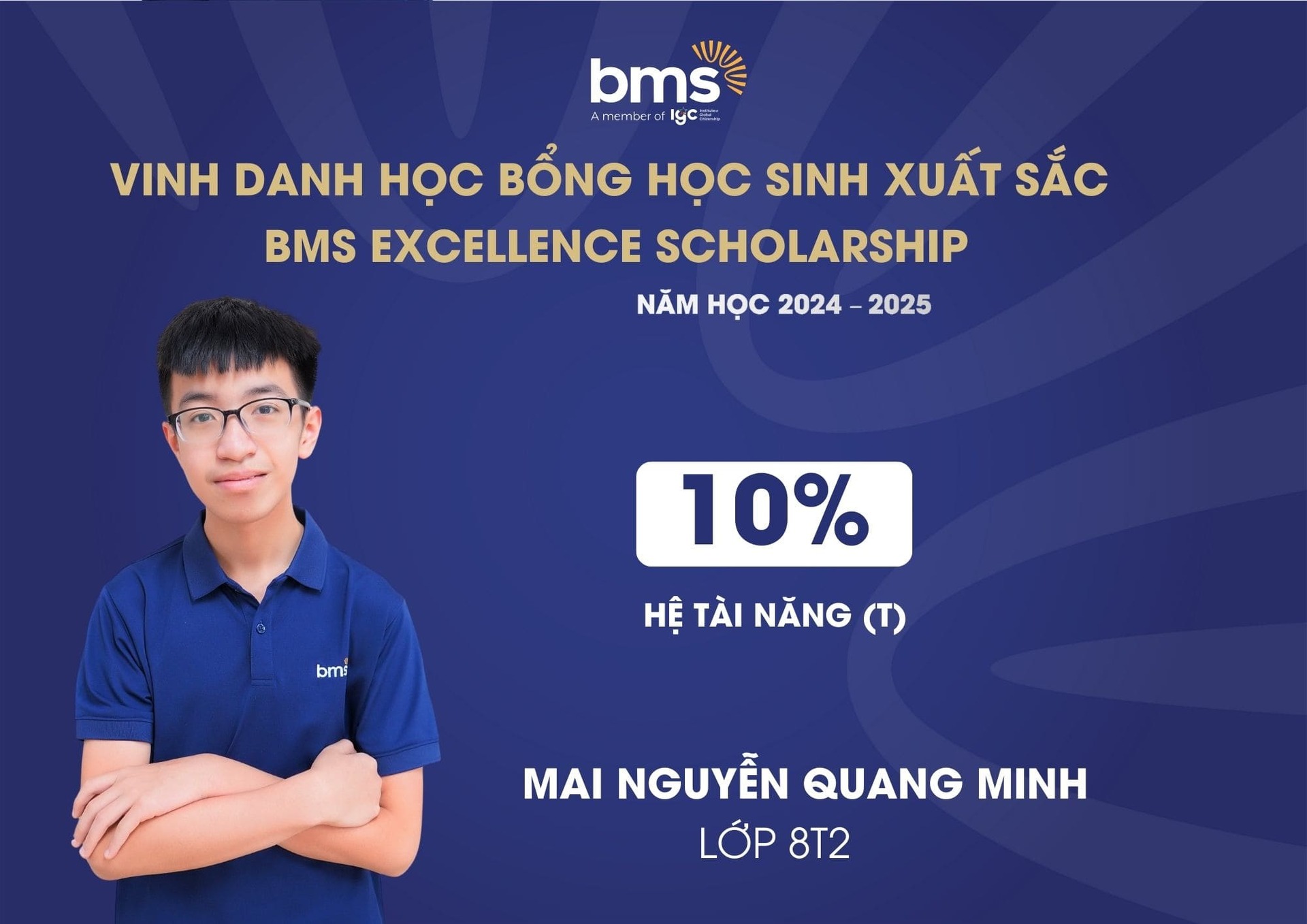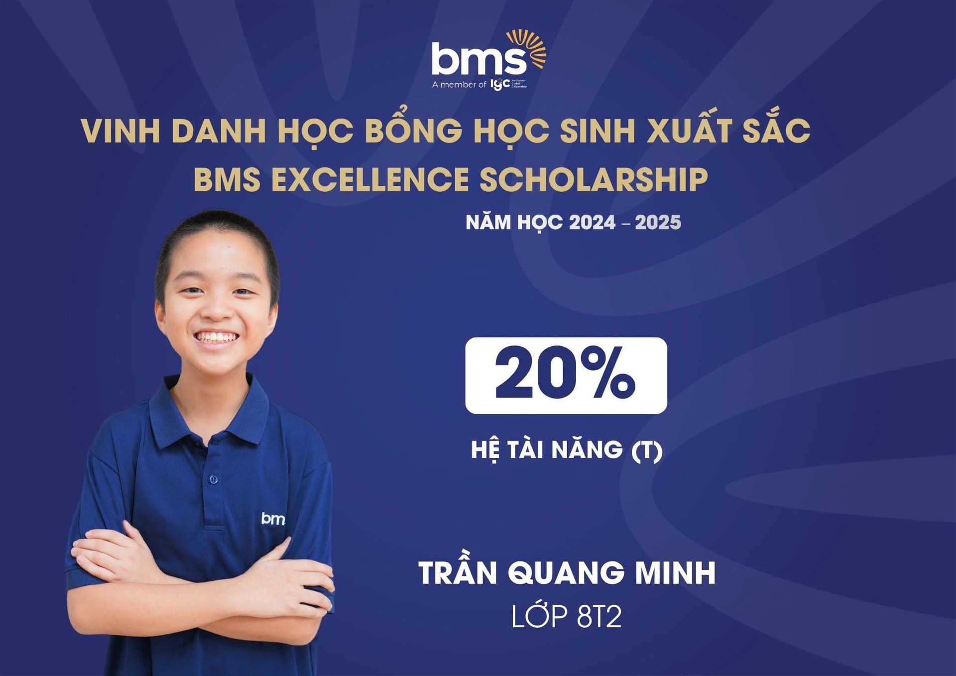 Năm học 2024 – 2025, học bổng “BMS Excellence Scholarship” tiếp tục được trao cho các học sinh khối 7, 8, 9, 11, 12 có thành tích xuất sắc trong học tập và rèn luyện. Đây là chương trình học bổng nhằm tôn vinh những nỗ lực và thành tích vượt trội của học sinh trong học tập và các hoạt động ngoại khóa.