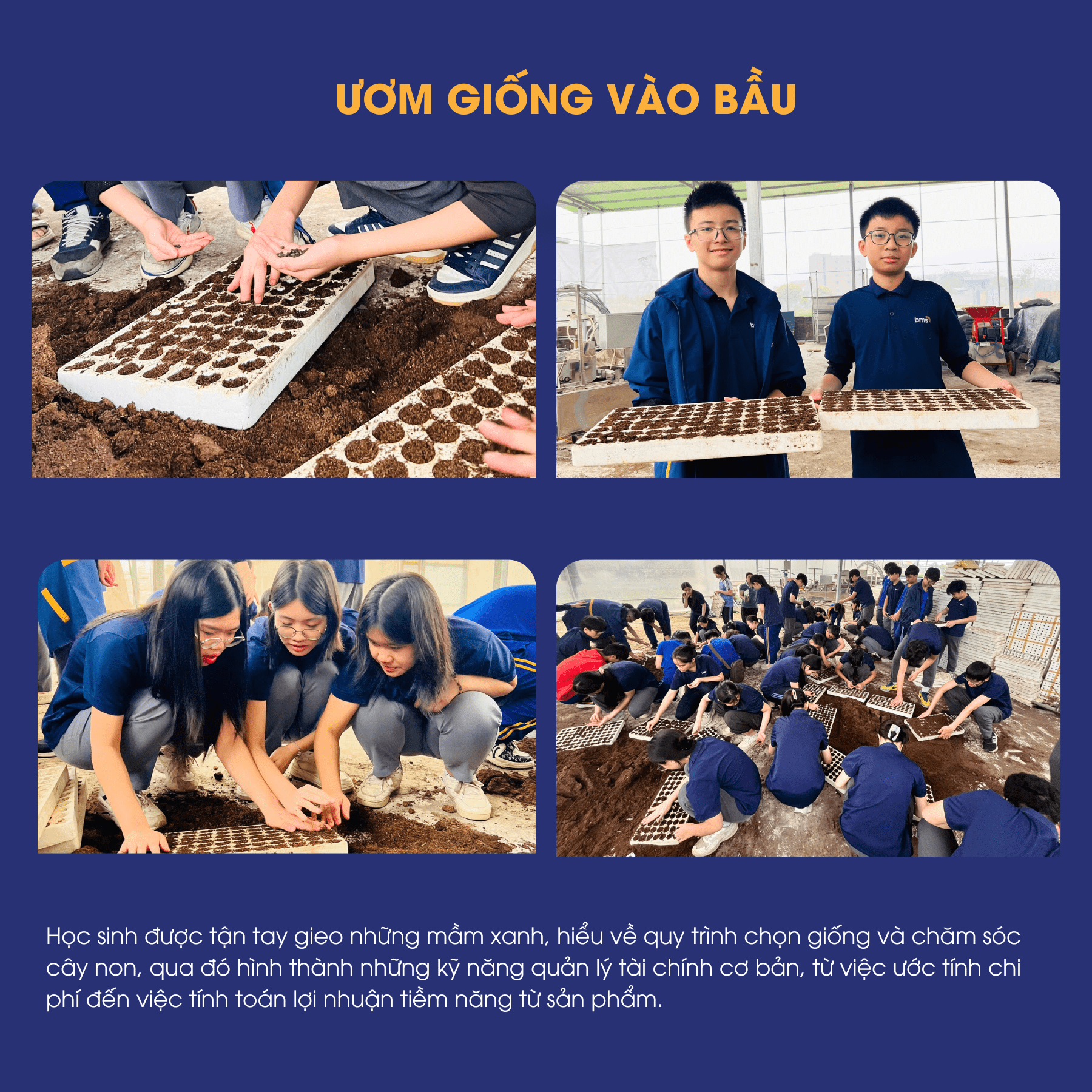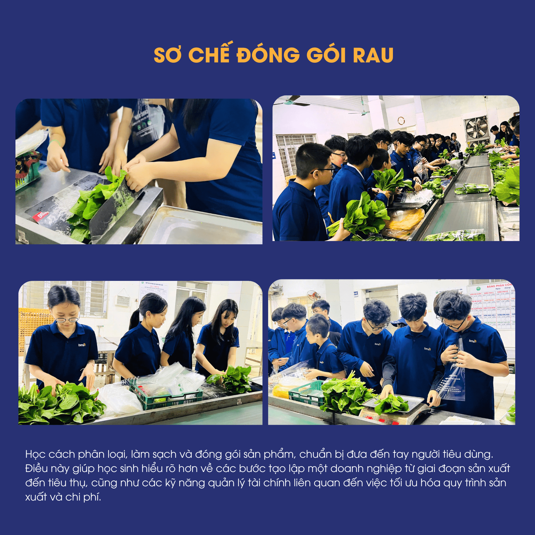 Các học sinh khối 8 Trường THCS Ban Mai được khám phá hành trình từ "ghế nhà trường” đến “ghế nhà máy, phân xưởng sản xuất” trải nghiệm trực tiếp quy trình sản xuất rau sạch – từ việc ươm giống, thu hoạch đến đóng gói sản phẩm. Điều này giúp các bạn hiểu thêm về nông nghiệp sạch và phát triển tư duy tài chính và kỹ năng quản lý chi phí trong một mô hình kinh doanh thực tế.