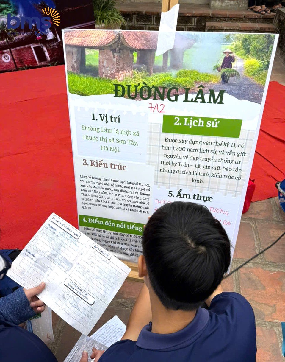Kiên định với phương châm giáo dục những công dân toàn cầu tương lai, hội nhập, tiếp biến những nét văn hoá mới, hiện đại trên nền tảng vững chắc là văn hoá truyền thống để mỗi Bmser đều giữ cho mình một “trái tim Việt”, các cô giáo tổ Ngữ văn đã thiết kế dự án học tập trải nghiệm, đưa các con về với làng cổ Đường Lâm – nơi lưu giữ những dấu ấn văn hoá Việt đậm nét, trên từng con đường, mái ngói, chất chứa trong tâm hồn những người dân và thấm đượm trong cả những đặc sản dân dã nơi đây.