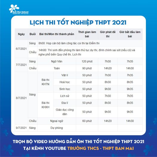 Trường THPT Ban Mai thông báo lịch thi tốt nghiệp THPT năm 2021.