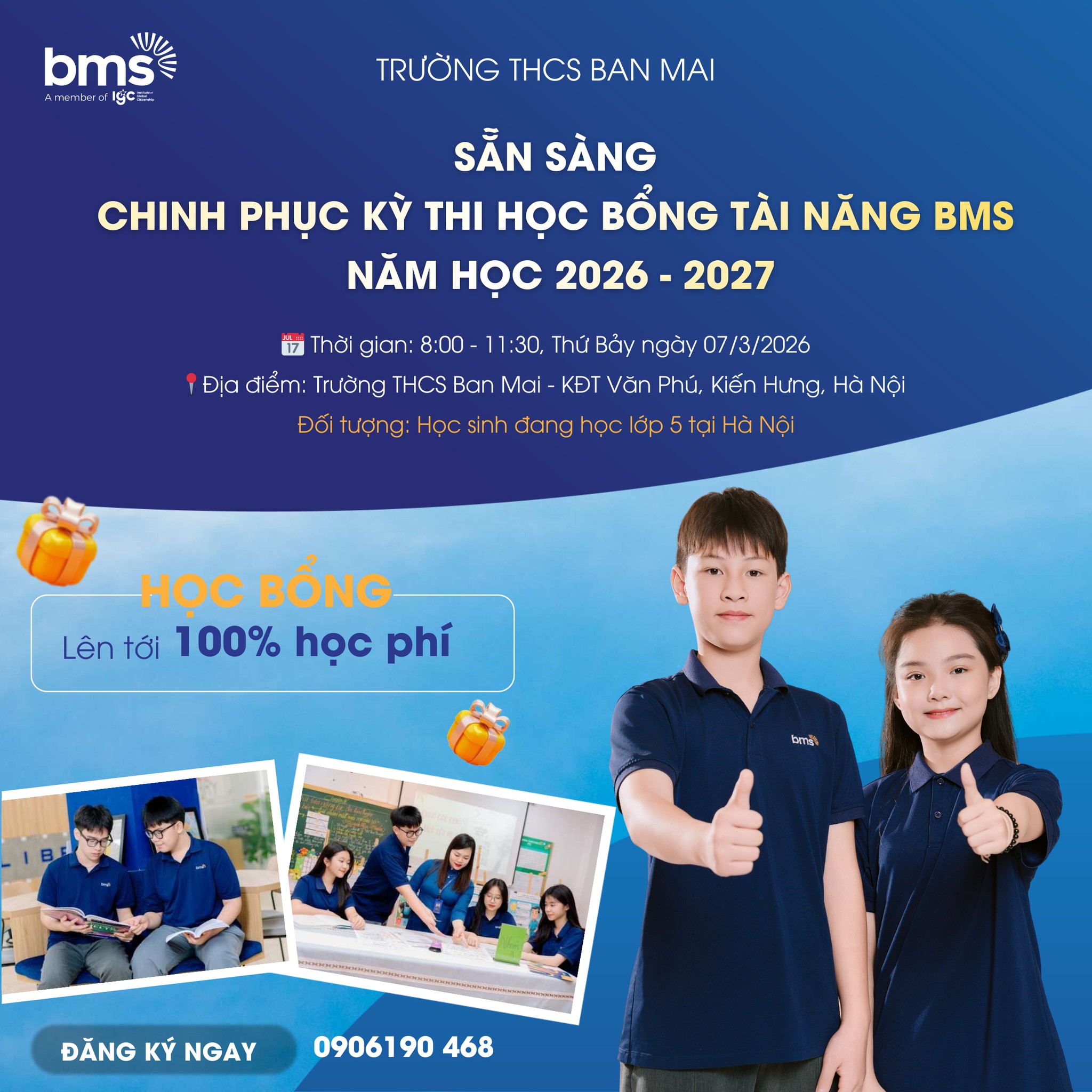 Đăng ký ngay hôm nay để tham gia Kỳ thi Học bổng Tài năng BMS diễn ra vào ngày 07/03/2026 – cơ hội bứt phá giới hạn bản thân, khẳng định năng lực và giành những suất học bổng giá trị tại Trường THCS & THPT Ban Mai.