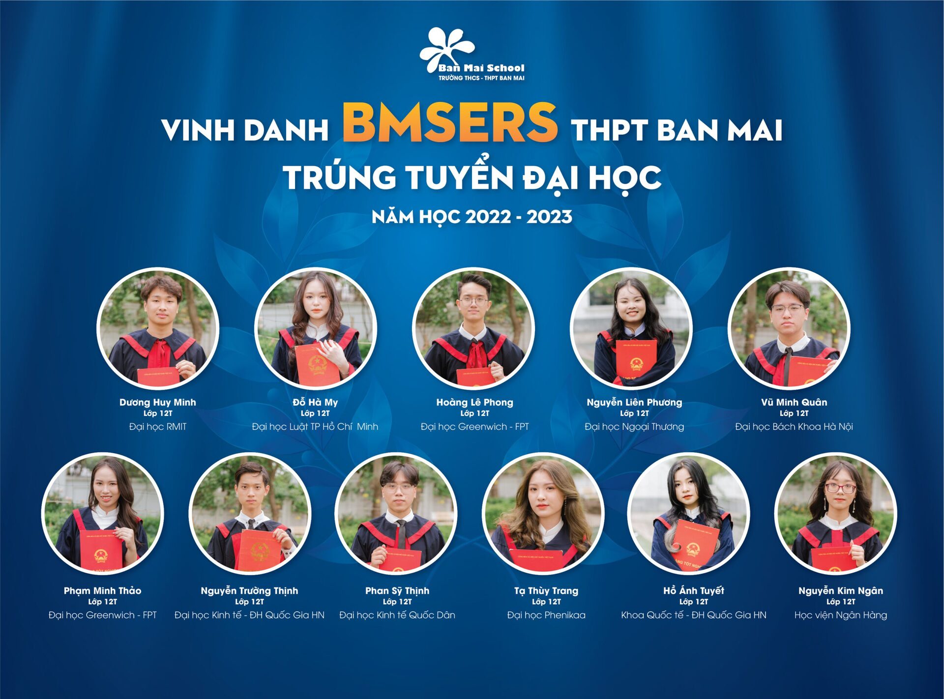 Năm học 2021 – 2022 của Trường THPT Ban Mai (Hà Đông) ghi dấu những thành tích đáng tự hào của Thầy và trò Nhà trường. Bên cạnh các huy chương, các giải thưởng học sinh giỏi các cấp trong nước và Quốc tế, Thầy cô chúc mừng và vinh danh các BMSers đạt thành tích cao: 100% học sinh đỗ tốt nghiệp THPT, 100% học sinh đỗ vào các trường ĐH, Cao đẳng và định hướng nghề. BMSers đã xuất sắc ghi danh vào các trường ĐH hàng đầu tại Việt Nam, trong đó có thể kể tới: ĐH Quốc gia Hà Nội, ĐH Bách Khoa, ĐH Ngoại Thương, ĐH Kinh tế Quốc dân, ĐH Hà Nội, ĐH Sư phạm, Học viện Ngân hàng,…