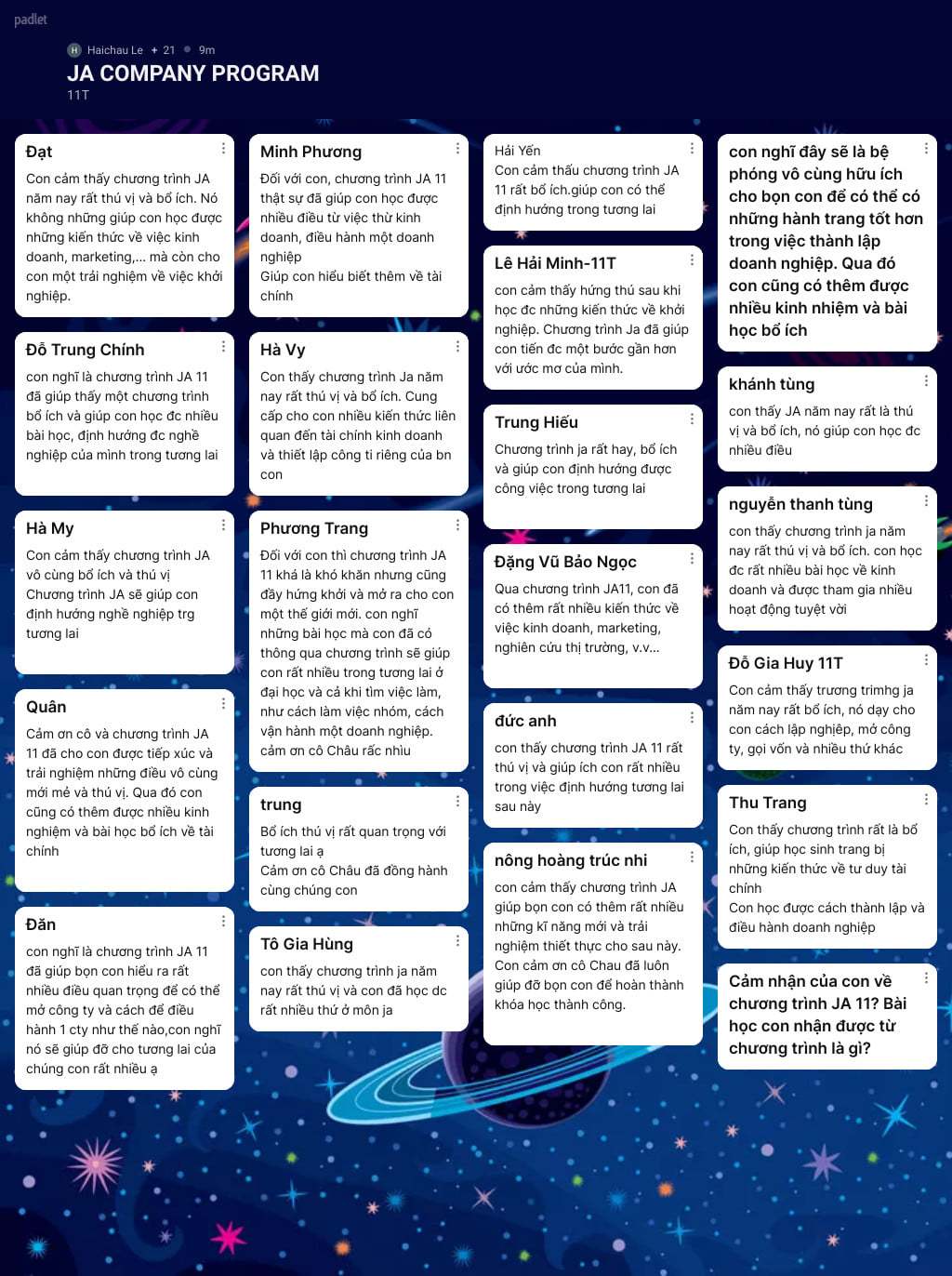 Sau 12 chủ đề của trình JA Company Program, các nhóm dự án đã có buổi báo cáo học tập cuối khoá với phương pháp thuyết trình dự án: phân tích thị trường, tìm hiểu khách hàng tiềm năng, thiết kế bộ nhận diện thương hiệu, lập mô hình kinh doanh, chiến lược quảng bá sản phẩm, cách thức huy động vốn…