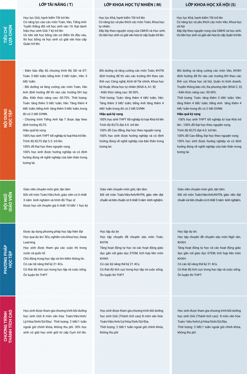 Thiết kế chương trình tăng cường các môn cốt lõi: Toán – Ngữ Văn – Tiếng Anh phù hợp với năng lực học tập của học sinh.