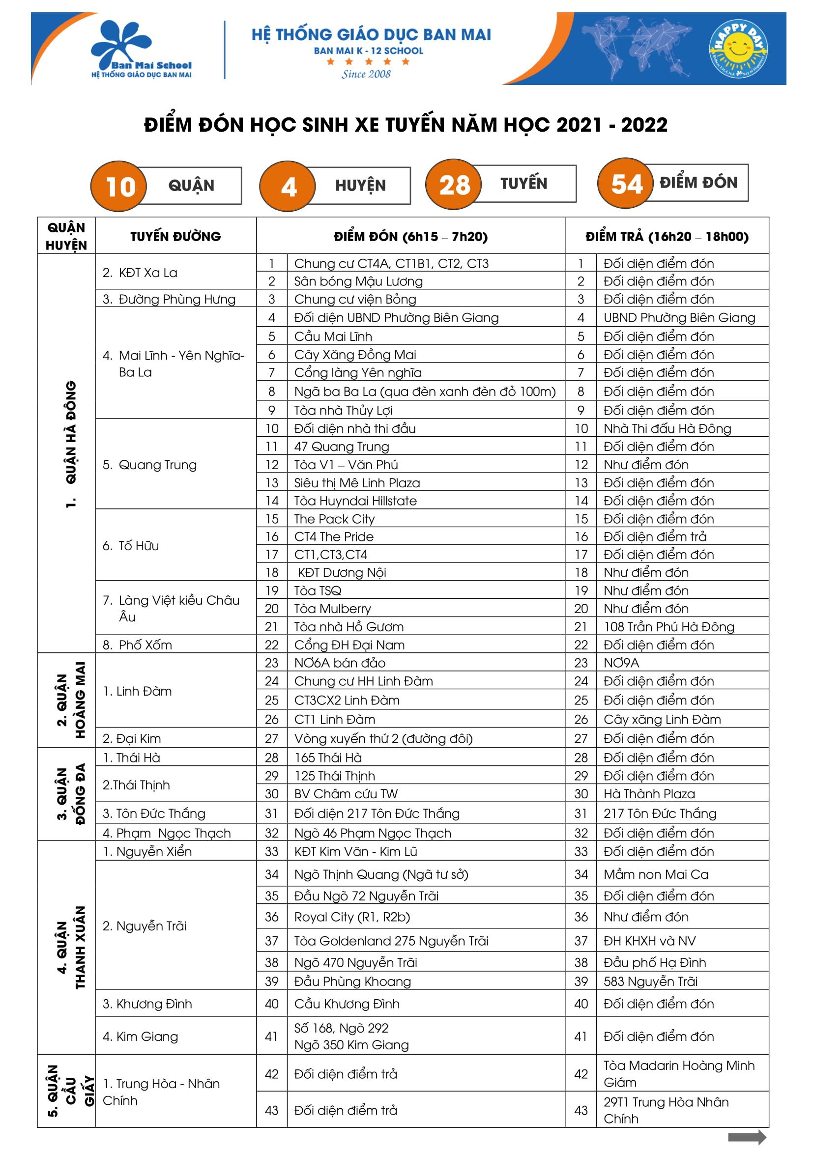 Để thuận tiện cho các trẻ ở xa địa điểm trường và tạo điều kiện thuận lợi cho Cha mẹ không có điều kiện đưa đón con, nhà trường có dịch vụ đưa đón học sinh (xe bus của trường) theo đăng ký. Ban Mai School Bus có mặt trên 10 Quận, 8 Huyện, 28 Tuyến, 54 Điểm đón. Quý CMHS có thể tham khảo lộ trình xe tuyến chi tiết tại link này: https://old.banmaischool.edu.vn/lo-trinh-xe-tuyen/