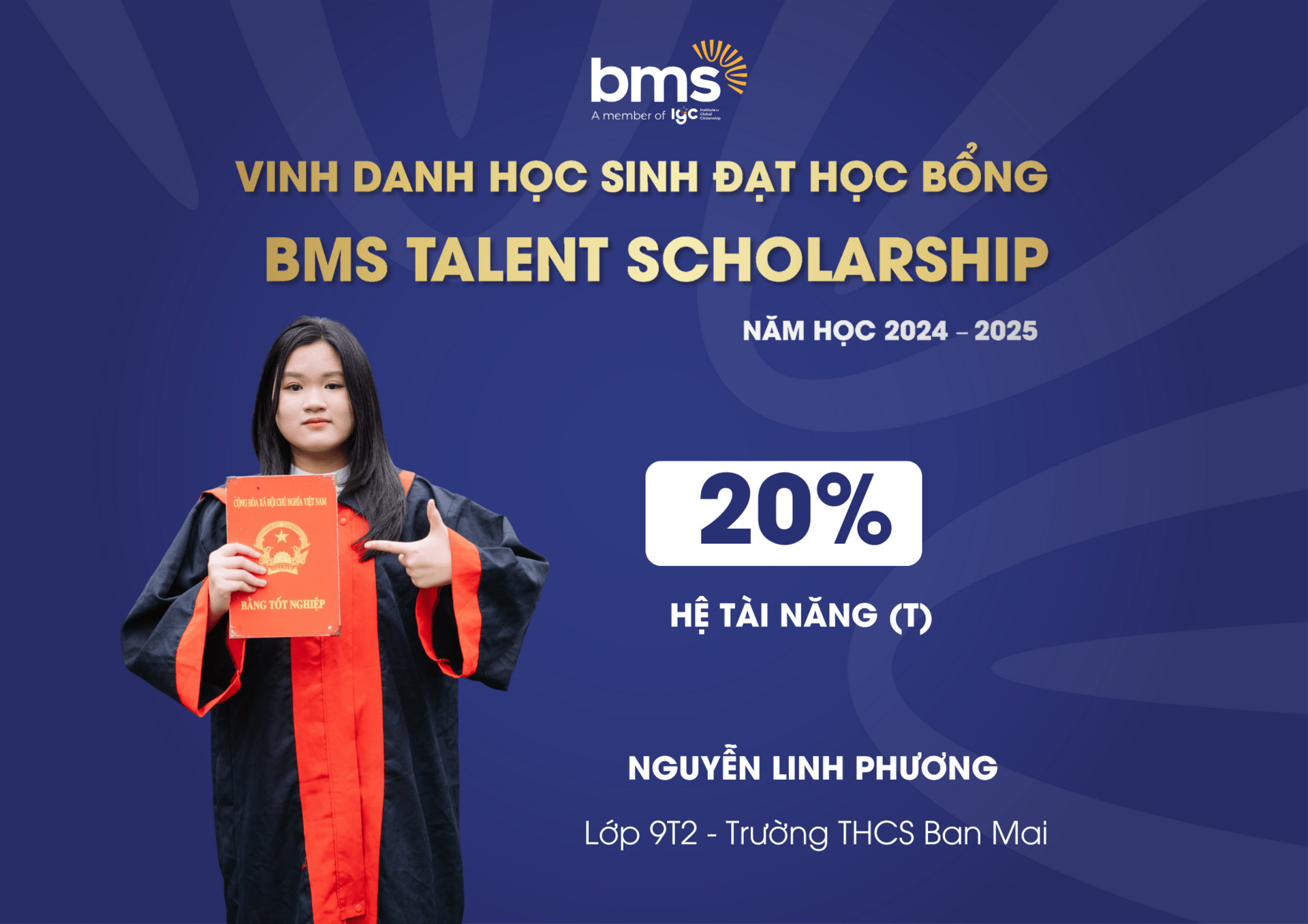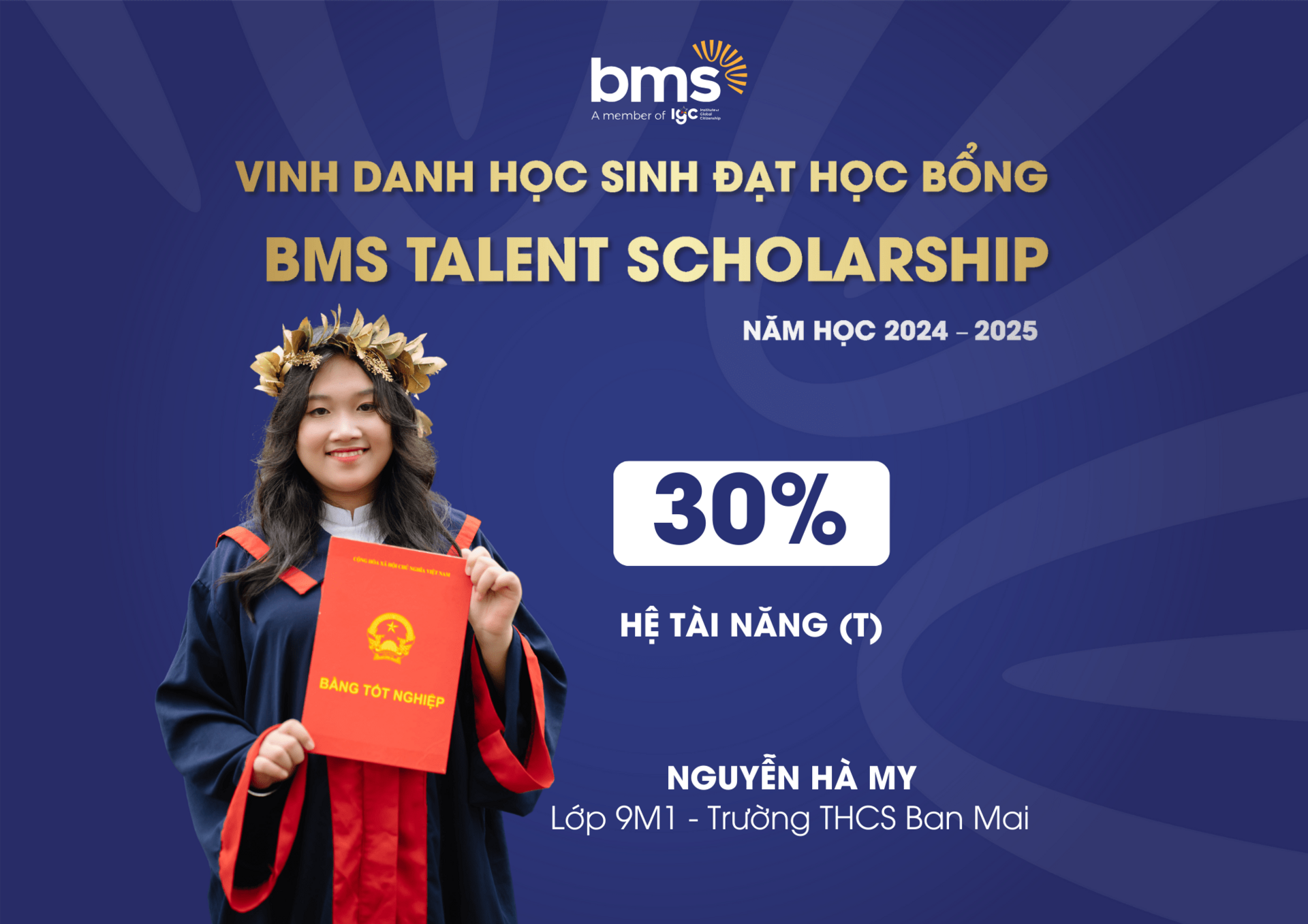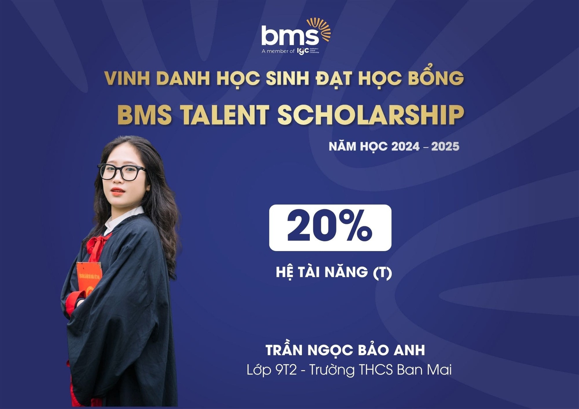 Đây là học bổng danh giá, tôn vinh những học sinh đạt thành tích cao ở các cuộc thi về học thuật, năng khiếu, đồng thời tạo cơ hội cho các bạn được học tập, phát triển khả năng vượt trội của mình trong môi trường giáo dục tại BMS.