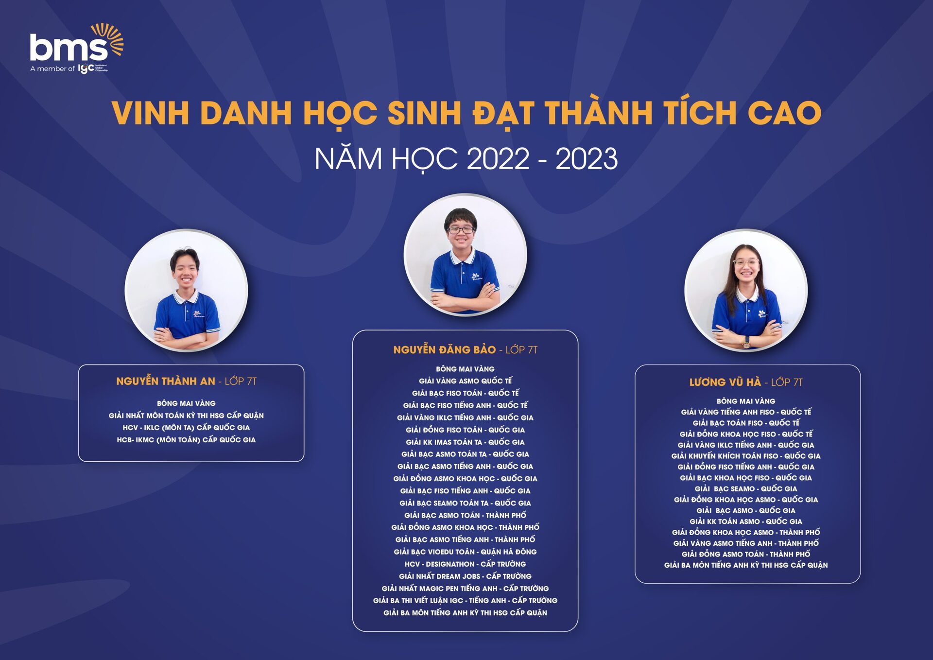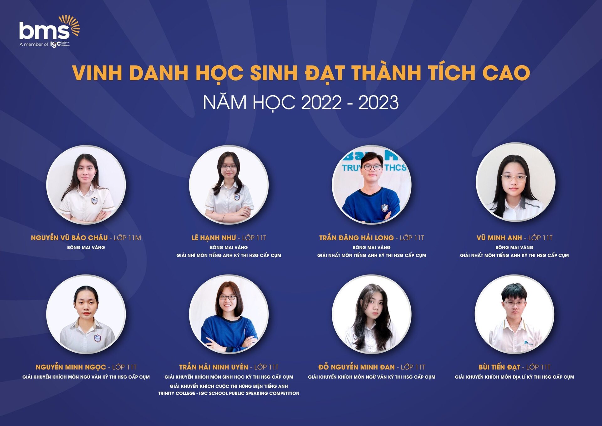 Với chương trình giáo dục vượt trội, môi trường giáo dục an toàn, hiện đại, tôn trọng sự khác biệt, nơi được tự tin thể hiện chính mình, BMSers đã đạt được những thành quả đầy xứng đáng.