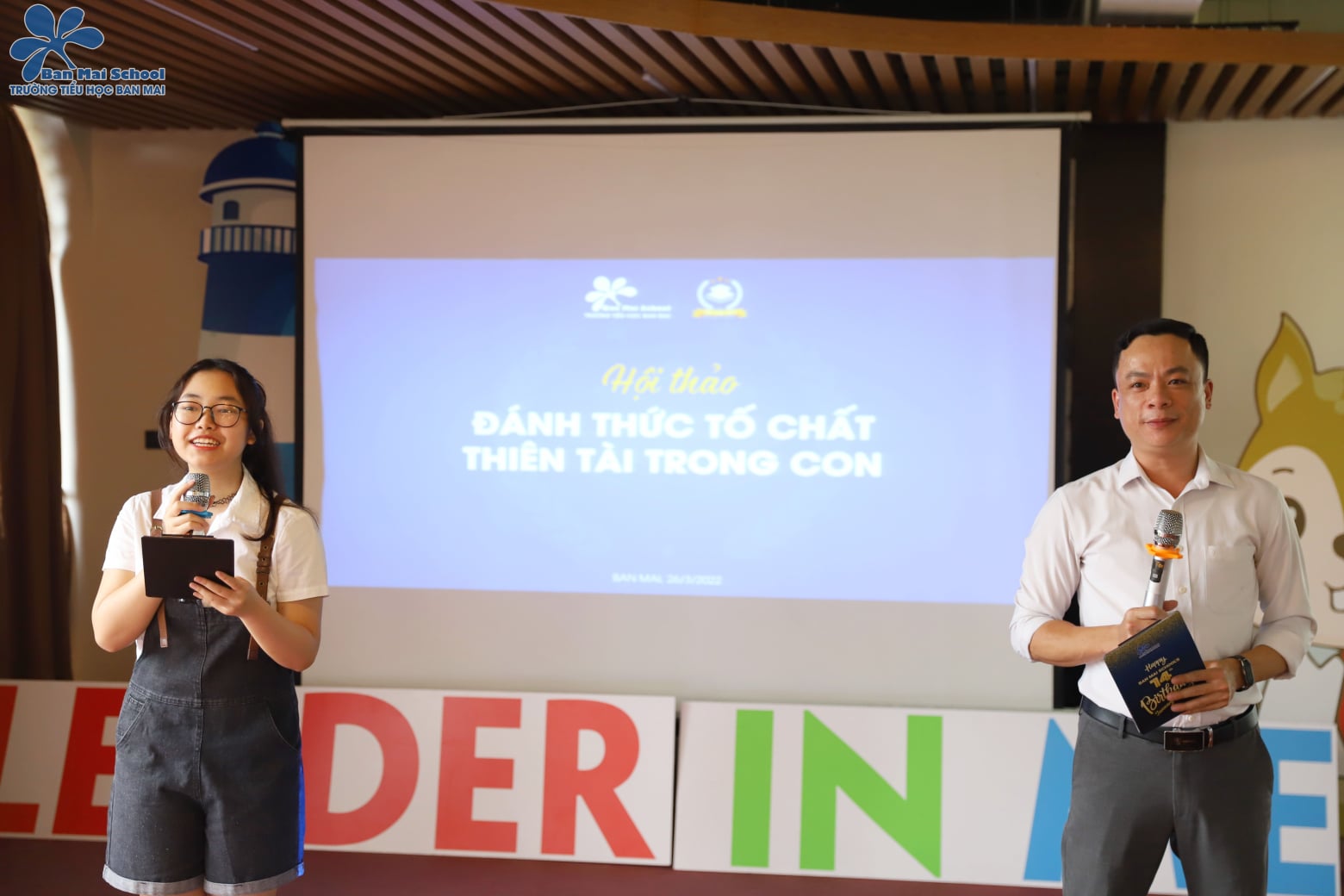 Đồng thời diễn ra cùng khoảng thời gian các con làm bài thi, là Hội thảo “Đánh thức tố chất thiên tài trong con” dành cho các cha mẹ, diễn ra tại Hội trường K1 nhà trường, với phần chia sẻ của cô Mai Thị Lan Anh – Nhà sáng lập Ban Mai school, và cô Nguyễn Thị Thanh Nương – Hiệu trưởng nhà trường.