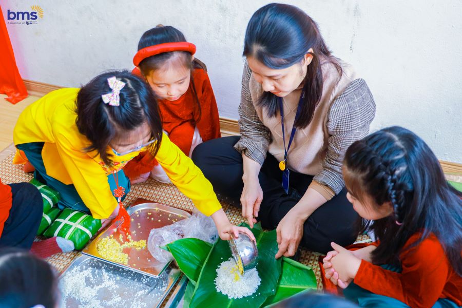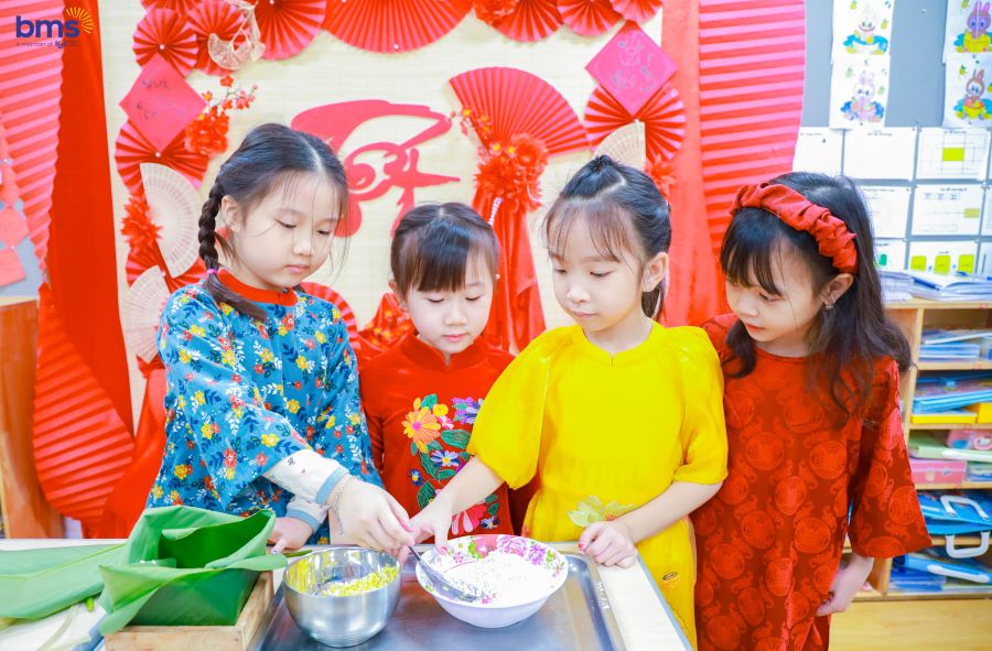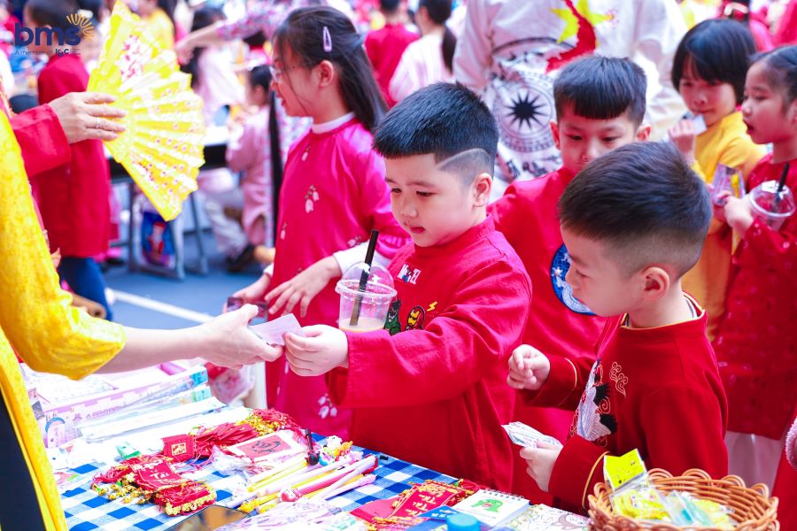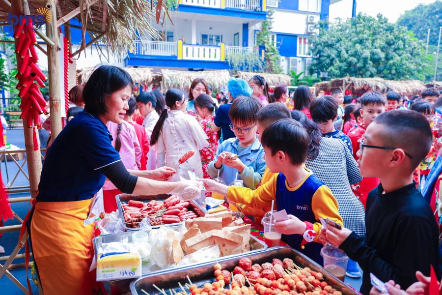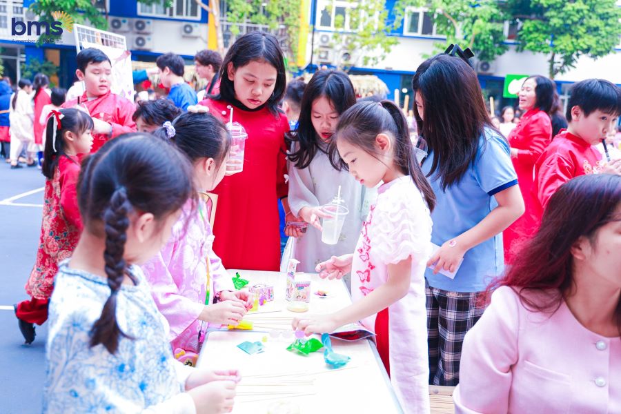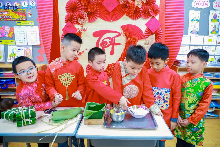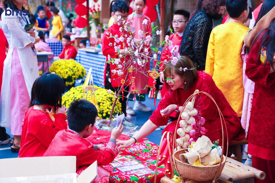 Trong không khí ngập tràn hương vị Tết cổ truyền tại BMS, Chuỗi hoạt động Tết cộng đồng 2025 không chỉ mang đến những hình ảnh quen thuộc của ngày Tết xưa mà còn tạo nên những trải nghiệm gắn kết ý nghĩa. Tại Bánh chưng xanh – Thịt đông dưa hành, cô trò BMS cùng nhau gói bánh chưng - món bánh truyền thống của người Việt mỗi dịp tết đến xuân về. Bữa cơm đoàn viên tái hiện khoảnh khắc ấm cúng khi cả gia đình quây quần bên mâm cỗ ngày Tết, thưởng thức hương vị truyền thống và trao nhau lời chúc an lành. Đặc biệt, không khí rộn ràng của Hội Xuân – Ngã tư kẻ chợ sẽ đưa ta trở về với những phiên chợ Tết Hà Thành xưa, nơi sắc đỏ câu đối, sắc vàng hoa mai hòa cùng tiếng rao hàng quen thuộc, mang đến một Tết trọn vẹn cả hương – sắc – vị.
