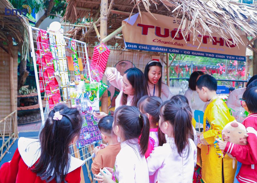 Sân trường tràn ngập những gian hàng rực rỡ sắc màu với đồ chơi, lịch Tết, cây cảnh đến những gian hàng ẩm thực truyền thống... Tất cả tạo nên một bức tranh Tết vừa quen thuộc, vừa gần gũi. Đặc biệt, những sản phẩm tái chế được chính BMSers sáng tạo, thu thập và bày bán cũng thu hút sự chú ý, gửi gắm thông điệp ý nghĩa về bảo vệ môi trường.