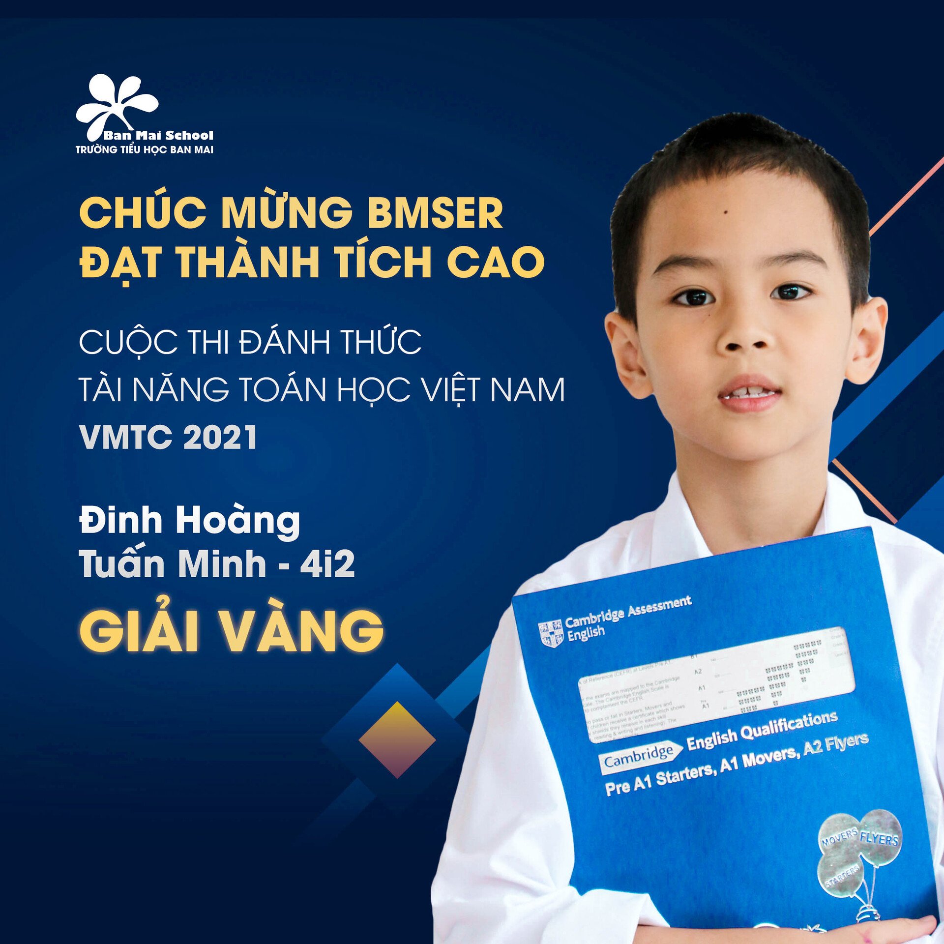 Chúc mừng 35 BMSers trường Tiểu học Ban Mai đạt thành tích cao tại kỳ thi Thách thức tài năng toán học Việt Nam (VMTC) 2021, với 3 giải Vàng, 7 giải Bạc, 8 giải Đồng, 17 giải Khuyến khích.