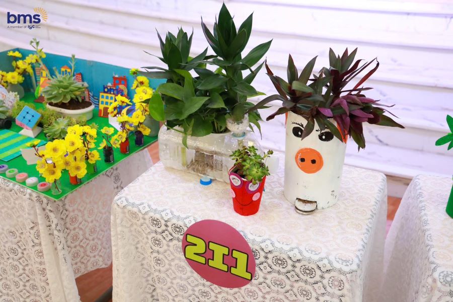 Từ những vật liệu tưởng chừng như không còn giá trị sử dụng, đôi bàn tay khéo léo và óc sáng tạo của BMSers đã biến chúng thành những sản phẩm tái chế độc đáo. Ngôi nhà cầu vồng rực rỡ từ những que kem, hộp bút xinh xắn, chậu cây xanh mát từ chai nhựa, hay thùng thu gom pin làm từ bìa carton – tất cả đều mang trong mình một thông điệp ý nghĩa: tận dụng, tái chế để giảm thiểu rác thải, bảo vệ hành tinh xanh.