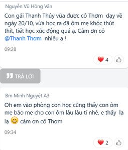 Video về những hình ảnh, cảm xúc bình dị mà ấm áp yêu thương, hạnh phúc này đã được chiếu lại cho hơn 1500 học sinh toàn trường xem trong tiết học online đầu tiên của buổi sáng 18/10, khơi nguồn và thôi thúc nhiều học sinh chủ động nói câu “Con yêu mẹ” khi tiết học vừa kết thúc.