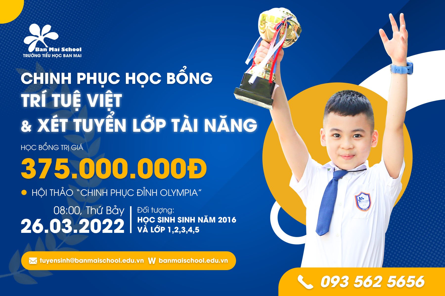Thứ Bảy, ngày 26/3/2022, Ban Mai School tổ chức Kỳ thi chinh phục Học bổng “Trí tuệ Việt” và Xét tuyển lớp Tài năng năm học 2022 – 2023