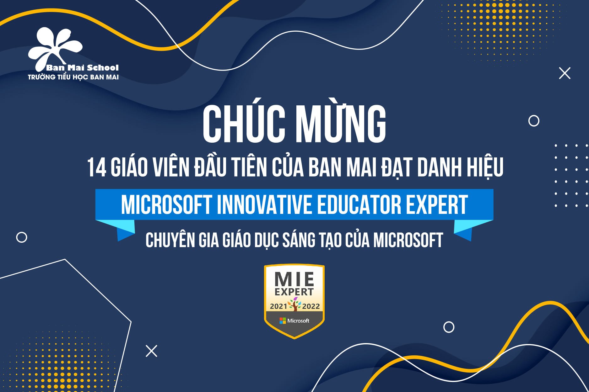 14 thầy cô giáo trường Tiểu học Ban Mai đã vinh dự được #Microsoft công nhận là #MIEE – Microsoft Innovative Educator Expert 2021-2022 (Chuyên gia giáo dục sáng tạo của Microsoft cho giai đoạn 2021-2022).