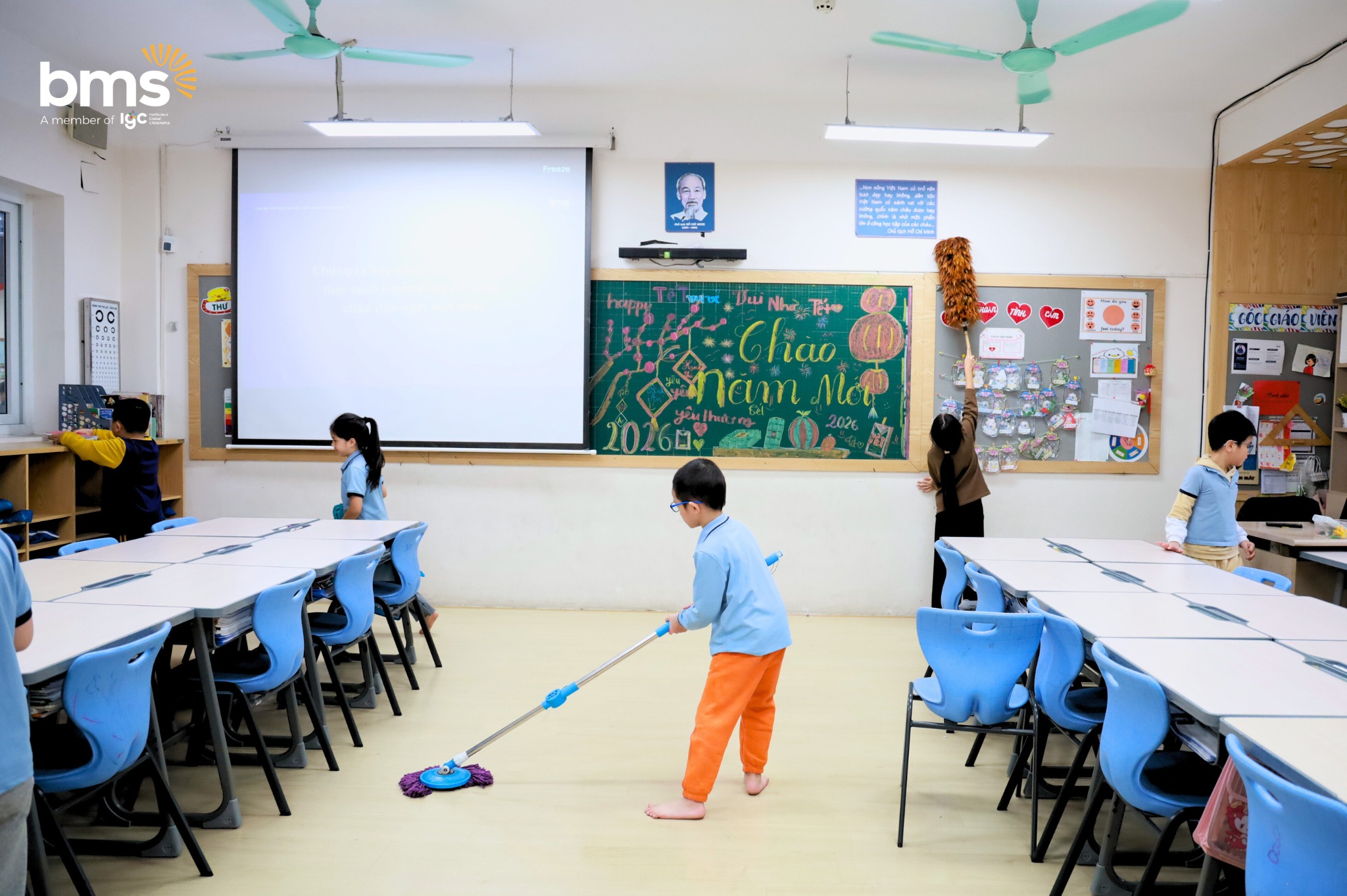 Tiếp nối những trải nghiệm ấy, hoạt động dọn dẹp lớp học đã mang đến cho BMSers cơ hội trực tiếp tham gia vào một phong tục quen thuộc của mỗi gia đình Việt mỗi dịp xuân về. Từng góc lớp được các con chăm chút, sắp xếp gọn gàng không chỉ làm mới không gian học tập, mà còn gửi gắm mong muốn khép lại những điều cũ và chào đón một năm mới với nhiều niềm vui, hy vọng và may mắn. Thông qua hoạt động này, các con dần hình thành ý thức trách nhiệm, tinh thần sẻ chia và niềm tự hào khi được góp phần giữ gìn những nét đẹp truyền thống.