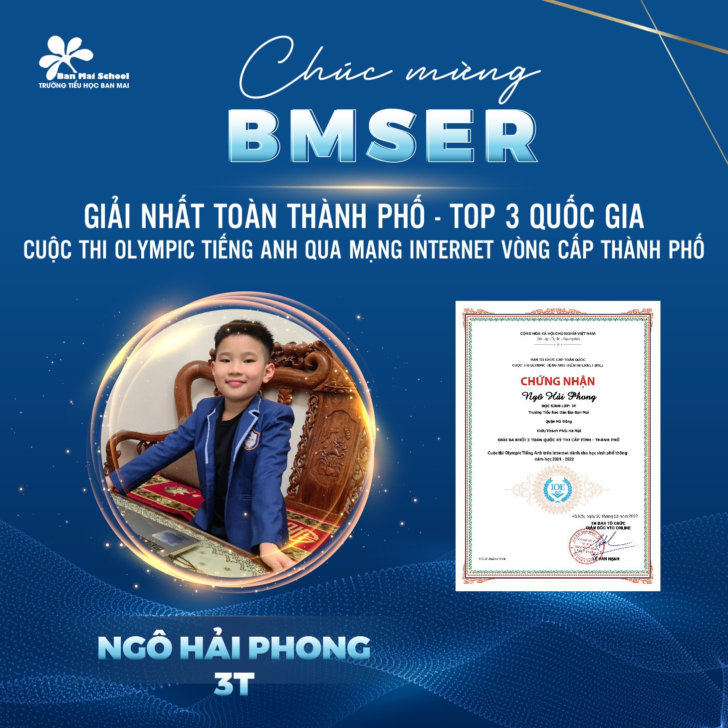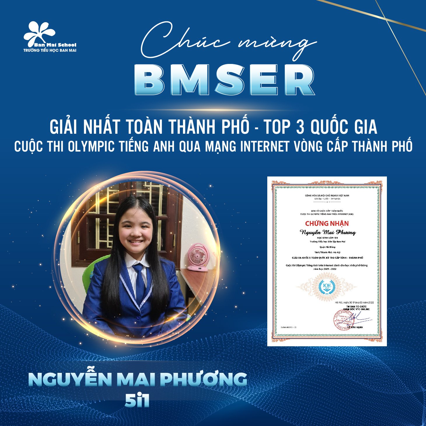 Chúc mừng 5 gương mặt BMSers đã đạt thành tích cao trong kỳ thi Giải Tiếng Anh qua mạng Internet (IOE) cấp Thành phố.