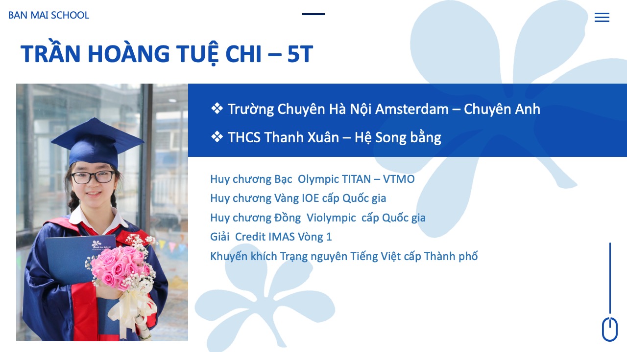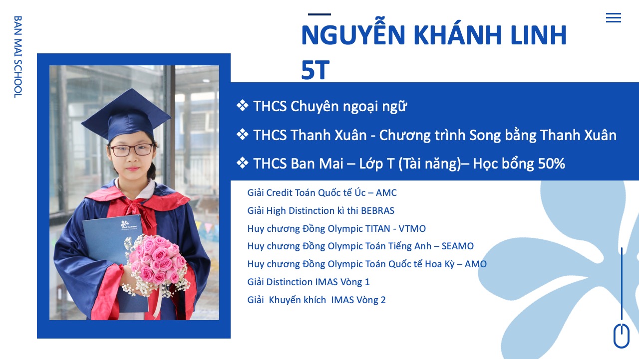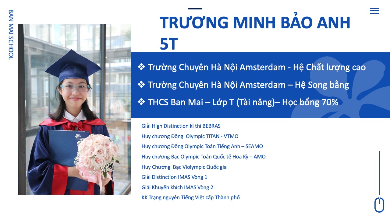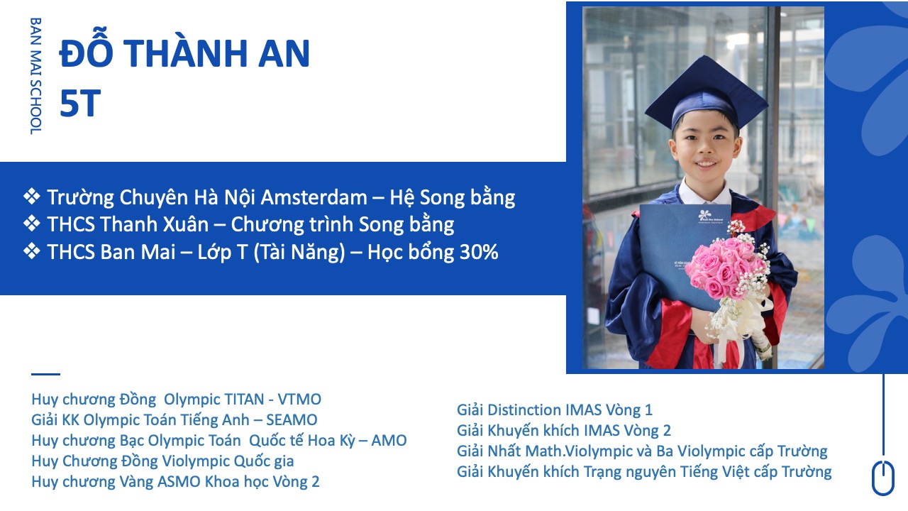 Cả 5 năm học con đều đạt danh hiệu Bông Mai Vàng và luôn nằm trong danh sách các học sinh tiêu biểu được Nhà trường vinh danh hàng năm. Con đã tham dự và đạt nhiều giải thưởng cao từ cấp trường đến cấp quốc tế. Và quan trọng nhất là con đã đạt số điểm cao thứ 19 trong tổng số hơn 3000 thí sinh tham gia kỳ thi vào hệ song bằng và chính thức trở thành thành viên của trường chuyên Hà Nội – Amsterdam theo đúng mục tiêu con đã đề ra khi bắt đầu năm học lớp 5.