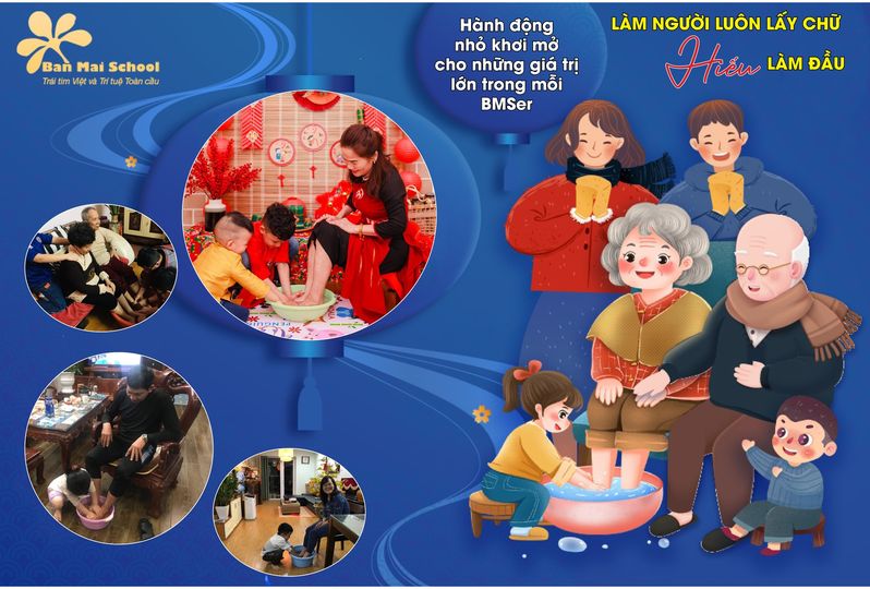 Cùng với chùm hoạt động Tết nhiều sắc màu thú vị, hoạt động ngâm nước thơm rửa chân cho ông bà cha mẹ luôn được thầy cô giáo Ban Mai căn dặn, chia sẻ, truyền cảm hứng để các con học sinh thực hiện.