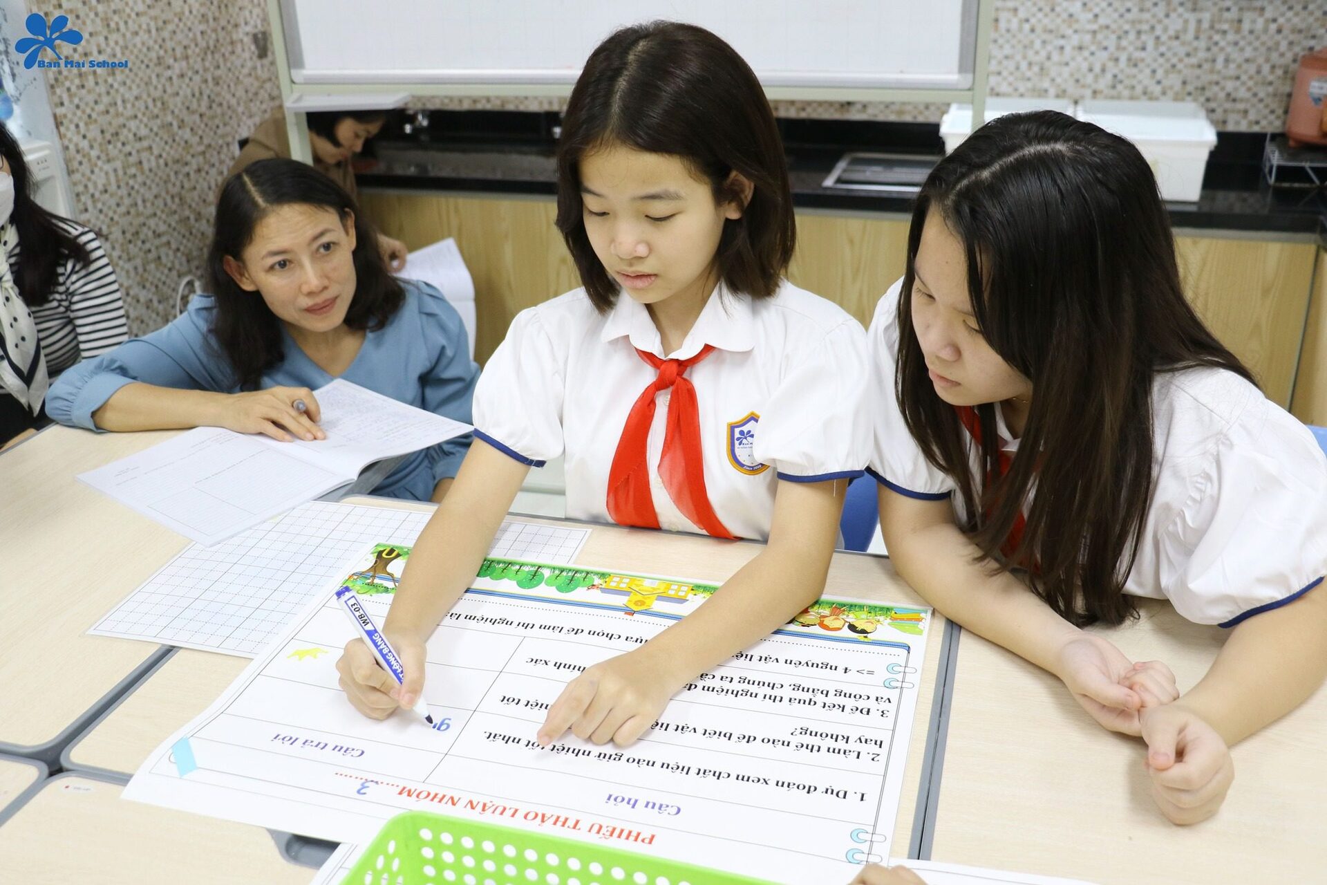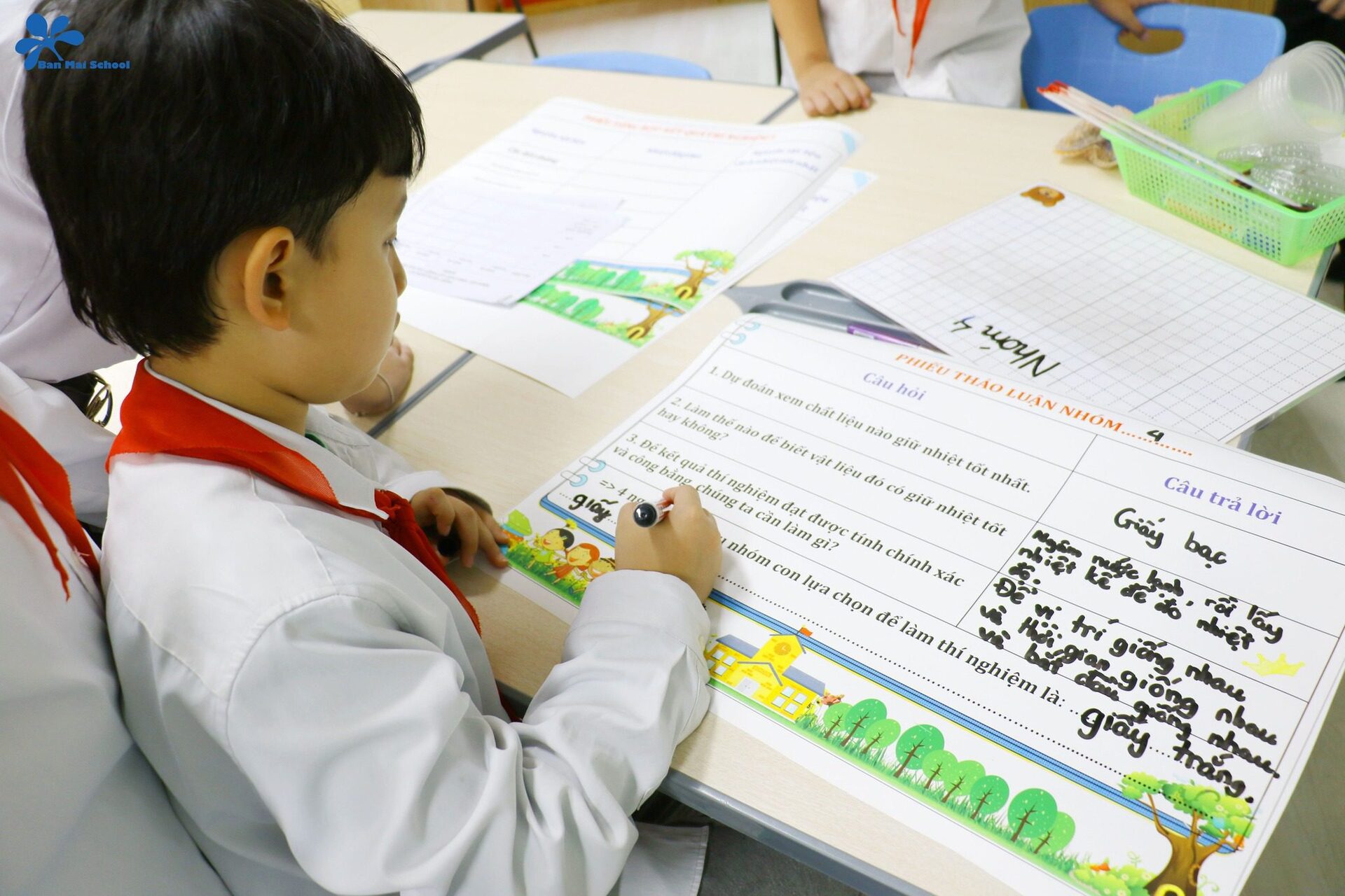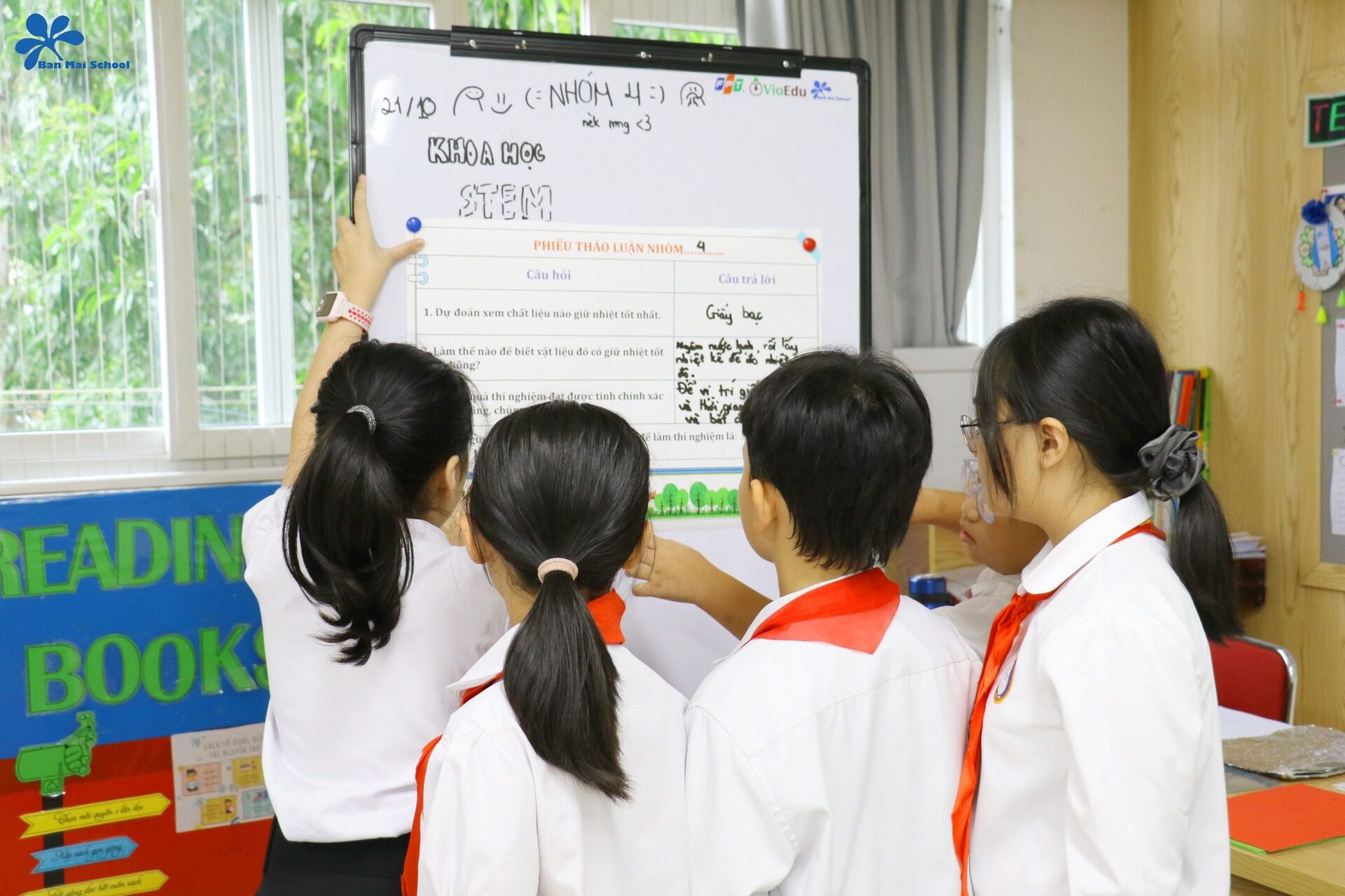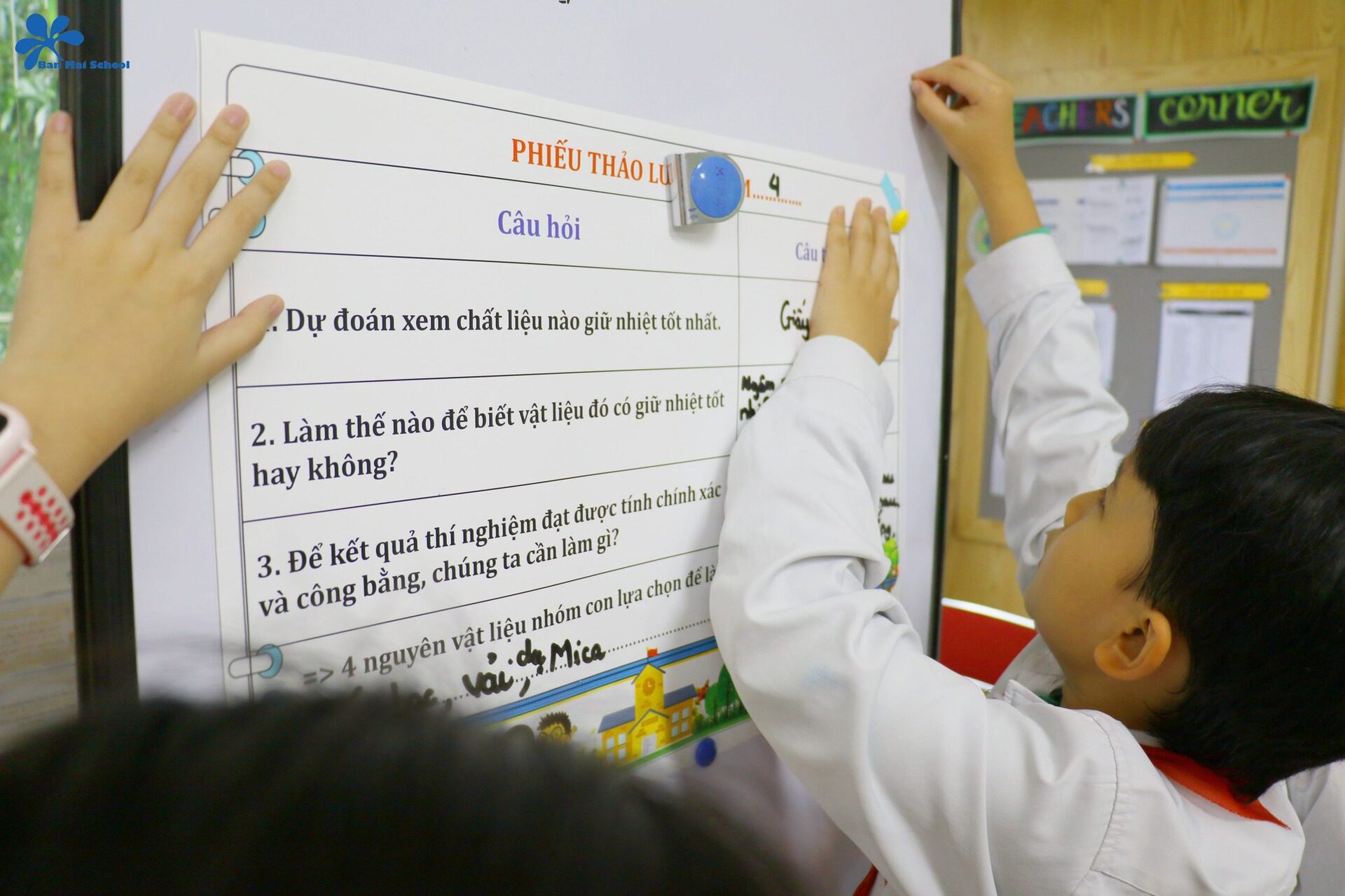 Thông qua tiết học, ngoài kiến thức khoa học thu lượm được các BMSers còn hình thành năng lực về tư duy phản biện, hợp tác nhóm – từ đó áp dụng các năng lực này vào hoạt động khảo sát việc thay đổi chất liệu, hình dáng của vật liệu.