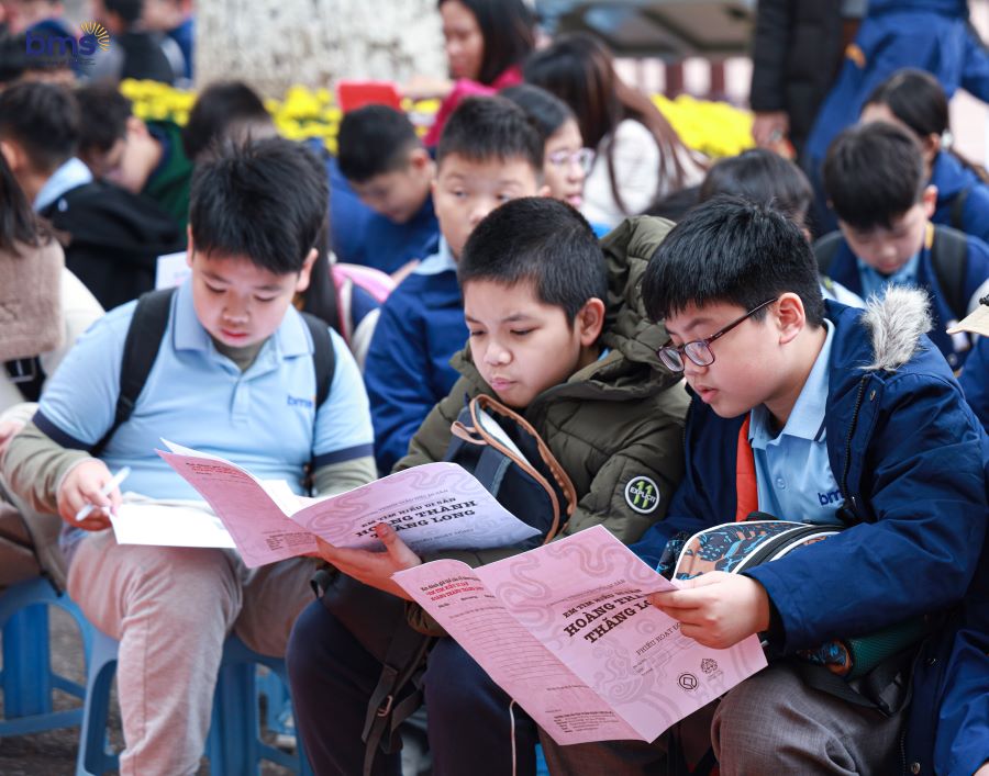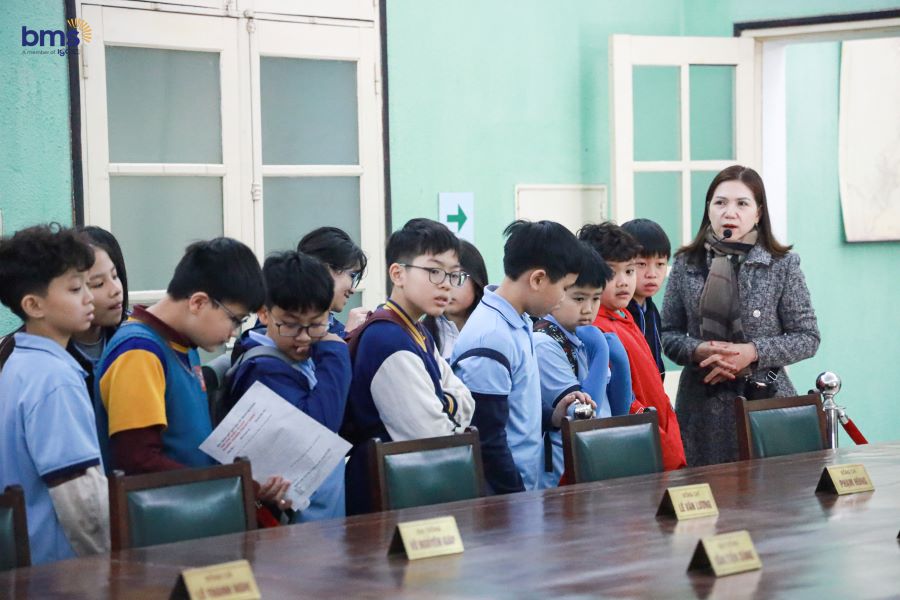 BMSers đặc biệt hứng thú khi tham quan Sân Đan Chì, nơi diễn ra những nghi thức quan trọng của triều đình xưa. Các em chăm chú lắng nghe với ánh mắt tò mò, khao khát tìm hiểu về di tích lịch sử. Qua từng bước chân, lịch sử dường như hiện lên rõ nét hơn, không còn là những trang sách khô khan mà là những câu chuyện sống động, truyền cảm hứng sâu sắc.