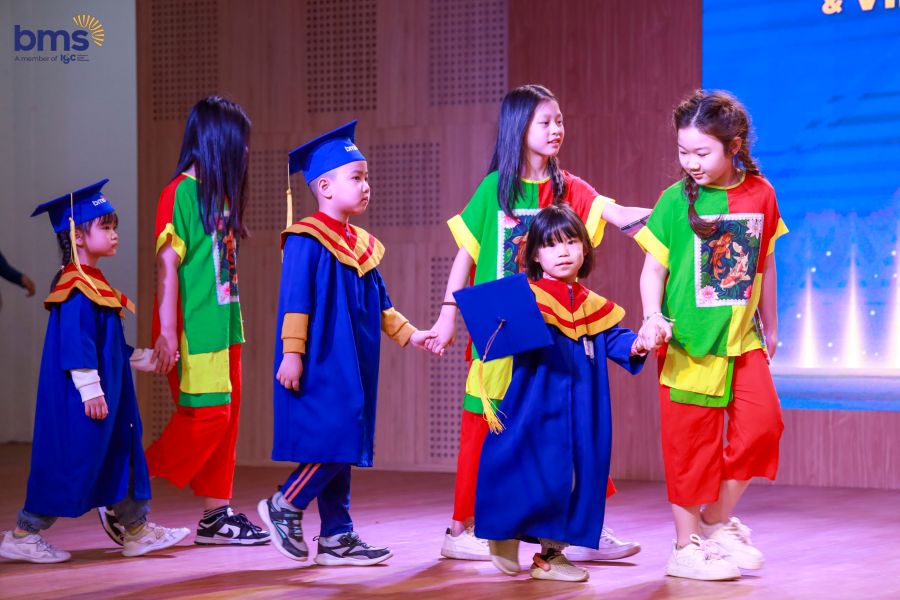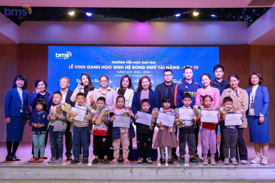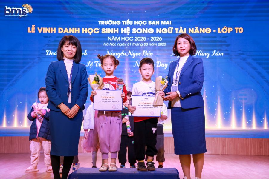 Bên cạnh đó, buổi lễ cũng là dịp BMS vinh danh và chúc mừng các bạn nhỏ đã xuất sắc vượt qua bài đánh giá năng lực để chính thức trở thành thành viên của hệ Song ngữ Tài năng. Đây là kết quả của sự cố gắng, tự tin và bản lĩnh mà các em đã thể hiện trong suốt quá trình trải nghiệm và rèn luyện. Việc được lựa chọn vào hệ Song ngữ Tài năng không chỉ ghi dấu bước ngoặt quan trọng trong hành trình học tập của mỗi học sinh, mà còn mở ra cánh cửa để các em tiếp cận một môi trường giáo dục hiện đại, toàn diện và giàu tính hội nhập – nơi các em sẽ tiếp tục phát triển trí tuệ, kỹ năng ngôn ngữ, tư duy phản biện và năng lực lãnh đạo để trở thành một công dân toàn cầu trong tương lai.
